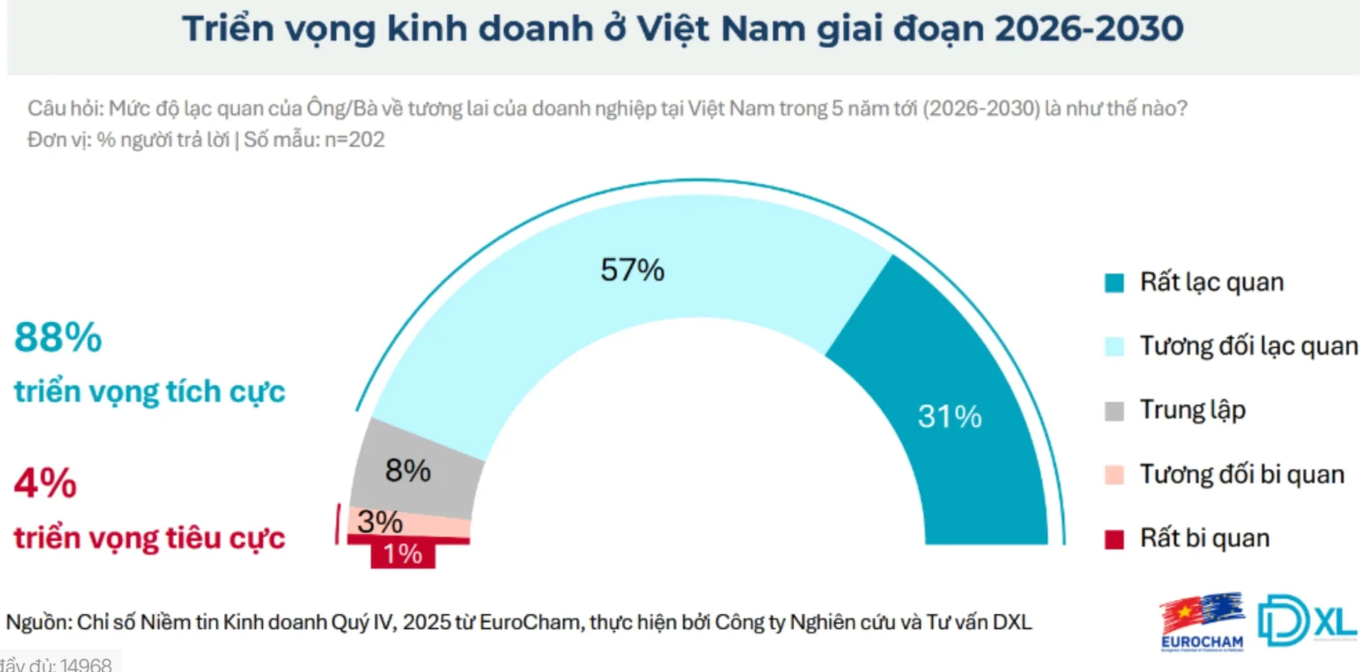 Quan trọng hơn, 56% DN ghi nhận sự lạc quan ngày càng tăng đối với Việt Nam như một điểm đến để hoạt động hoặc đầu tư. Chủ tịch Jaspaert nhận xét, đây là tăng trưởng bất chấp bối cảnh bất ổn toàn cầu và những bất định kinh tế đi kèm. Thực tế cho thấy nền kinh tế đã chứng minh được sức bật đáng kể. Việt Nam khép lại năm 2025 với mức tăng trưởng GDP đạt 8,02%.