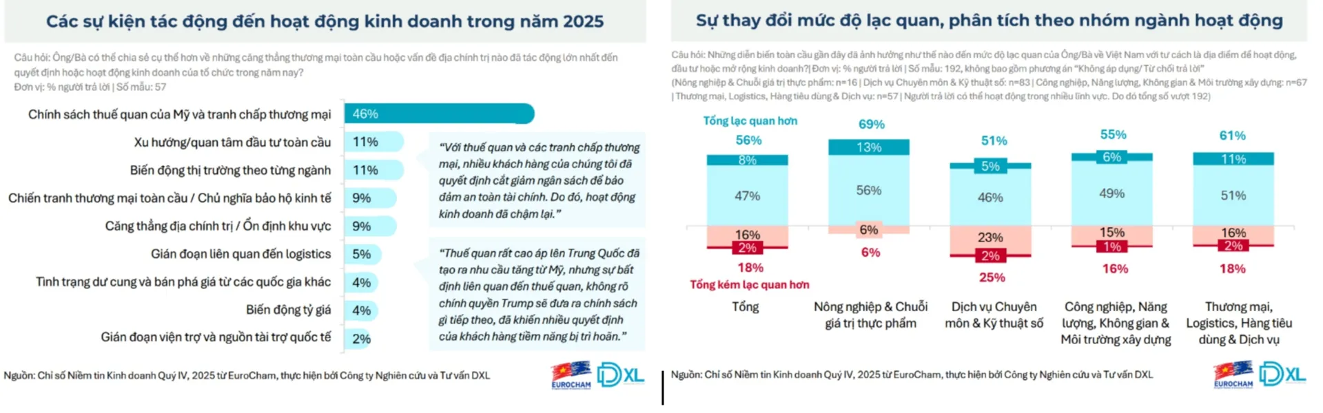 Trong đó, chính sách thuế quan Mỹ và các tranh chấp thương mại được nhắc đến nhiều nhất, với 46% DN xác định đây là rủi ro chính. Để ứng phó, cộng đồng DN đã triển khai một số điều chỉnh chiến lược. Tối ưu hóa chi phí là biện pháp phổ biến nhất (41%), tiếp theo là tăng cường ứng dụng công nghệ, tự động hóa và trí tuệ nhân tạo (35%). Một số DN lựa chọn đa dạng hóa hoạt động ngoài Việt Nam (23%) hoặc điều chỉnh kế hoạch đầu tư (19%) và chiến lược mở rộng (17%)...