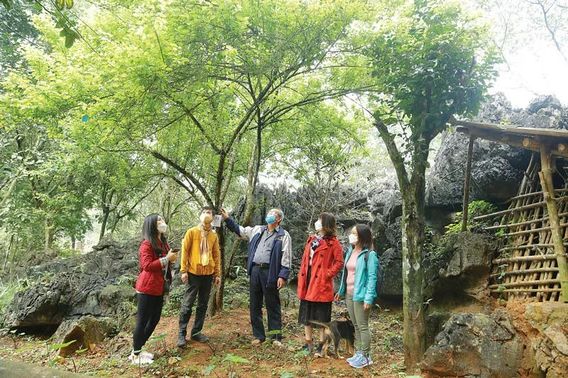 Khách du lịch tham quan rừng mơ Hương Tích tại xã Hương Sơn. Ảnh: Ngọc Ánh