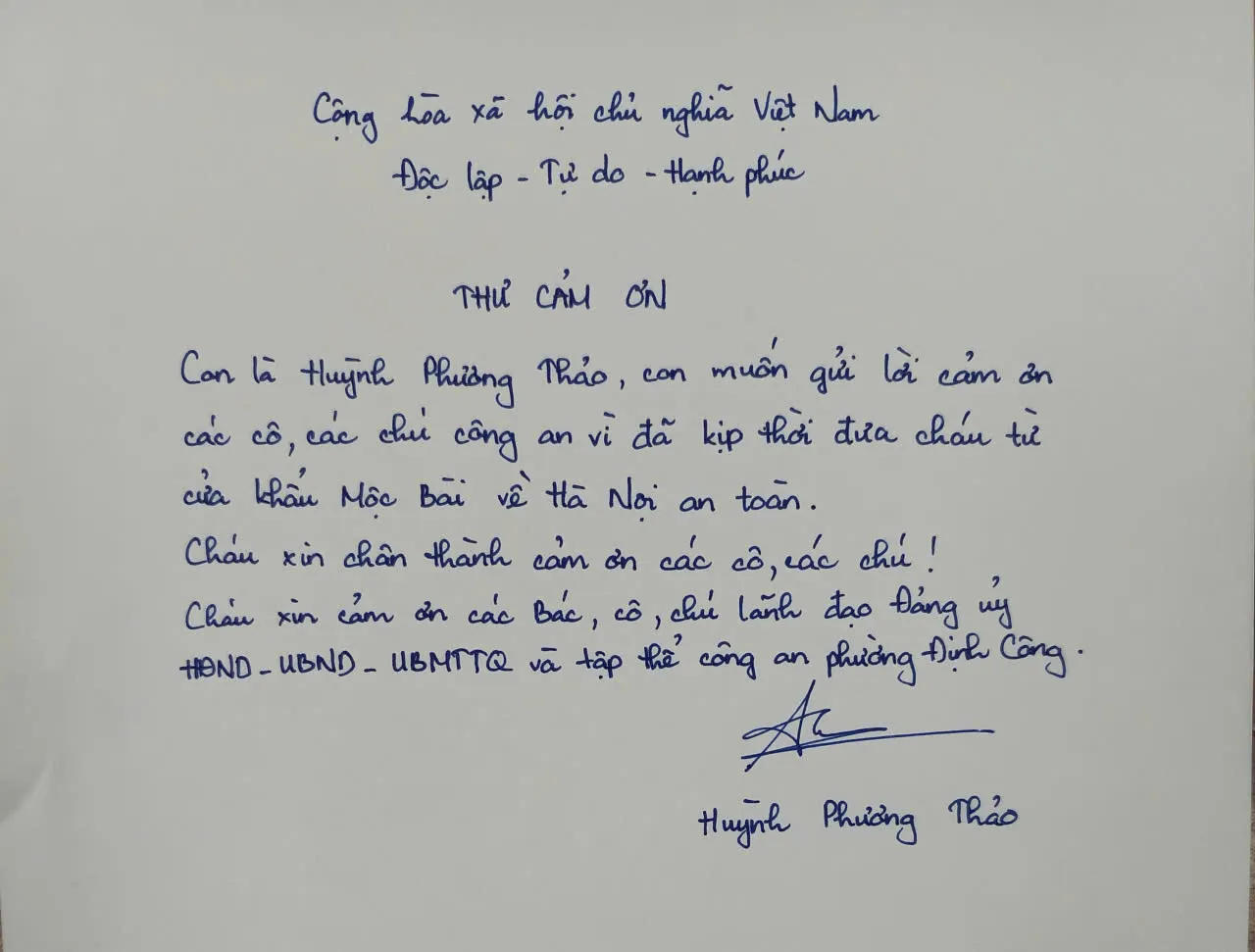 Nữ sinh phường Định Công được giải cứu tại cửa khẩu Mộc Bài cám ơn các đơn vị Công an