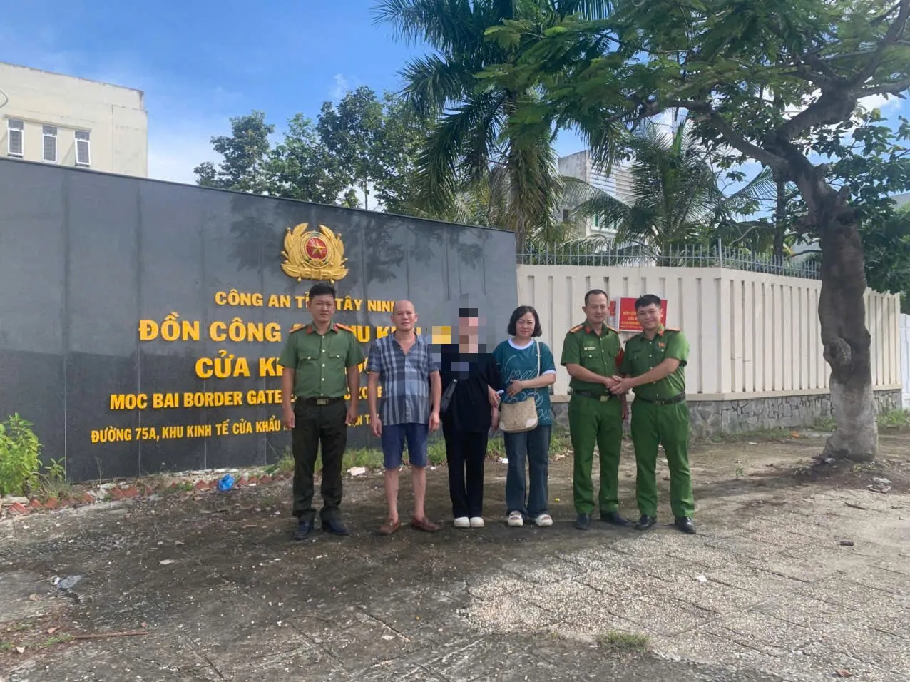 CAP Định Công và gia đình nhận bàn giao cháu T tại cửa khẩu Mộc Bài. Ảnh do cơ quan CA cung cấp.