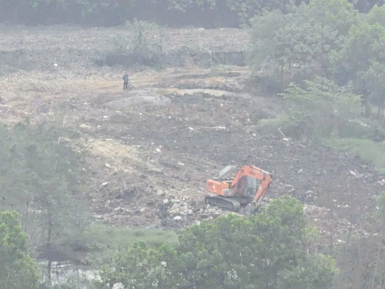 Bên trong nơi các xe tải đổ bùn đất và chất thải rắn, máy múc cỡ lớn được huy động hoạt động hết công suất để san gạt.