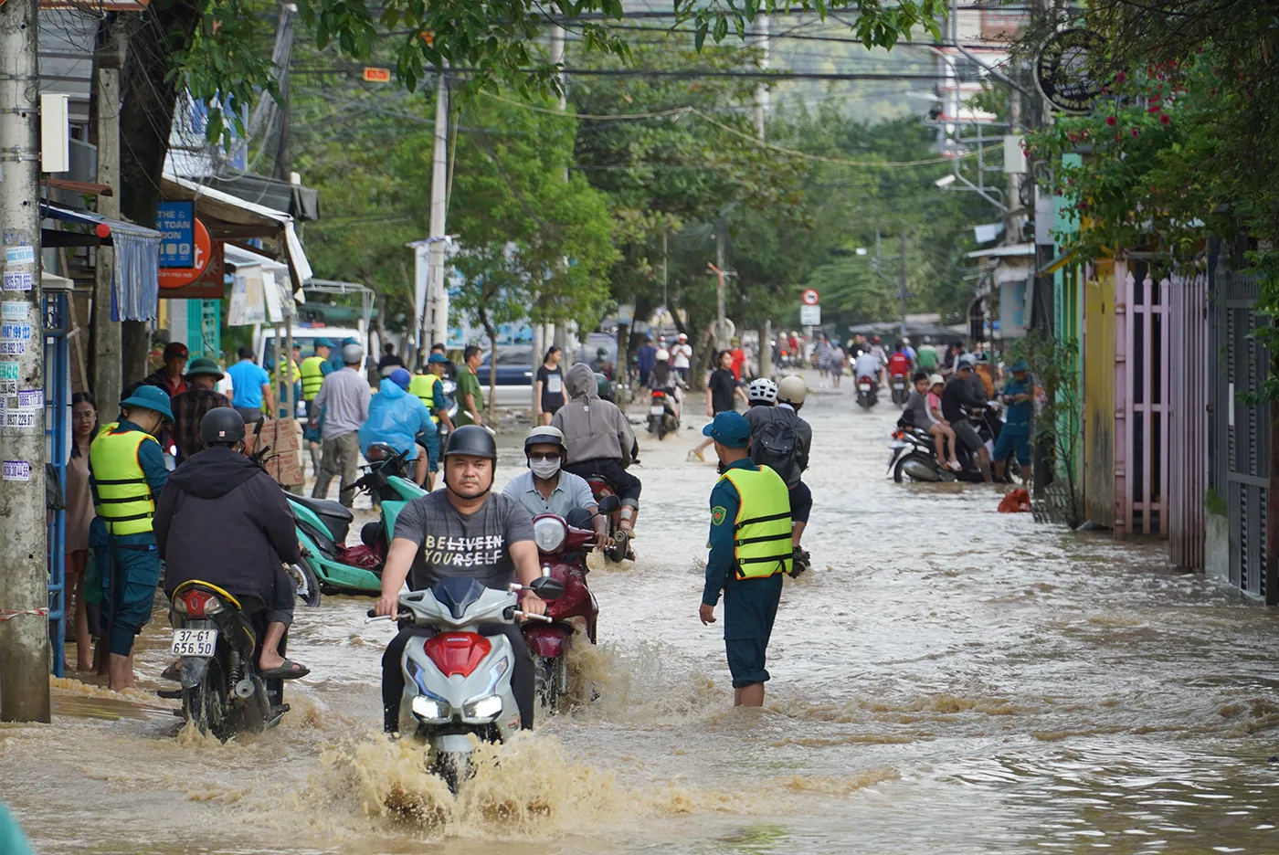 Lực lượng chức năng phường Bắc Nha Trang có mặt tại các điểm ngập để hỗ trợ người dân di chuyển.