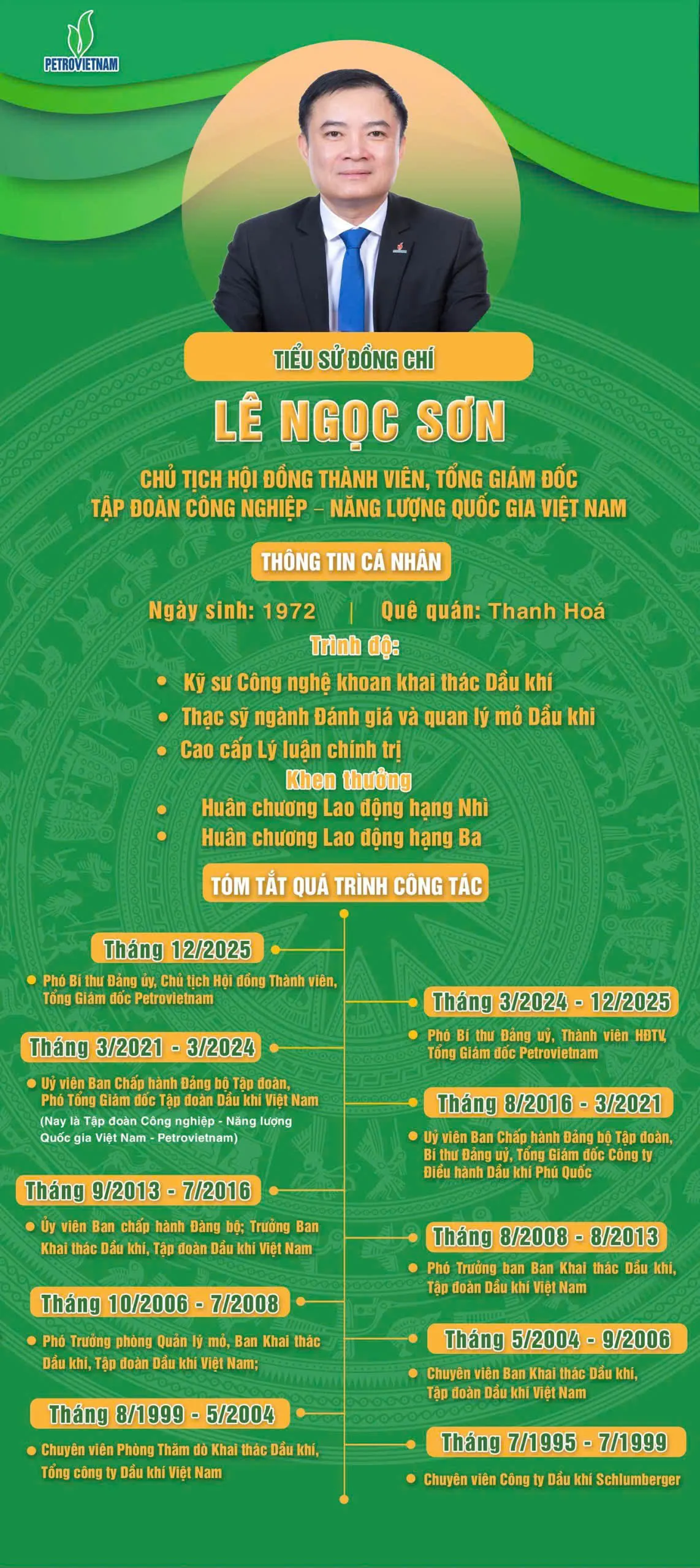 Ông Lê Ngọc Sơn (sinh năm 1972, quê Thanh Hóa) từng có nhiều năm công tác và đảm nhiệm nhiều chức vụ khác nhau tại Petrovietnam. Ông có chuyên môn trong lĩnh vực công nghệ mỏ, từng là Trưởng Ban Khai thác dầu khí PVN, Tổng giám đốc Công ty Điều hành Dầu khí Phú Quốc.