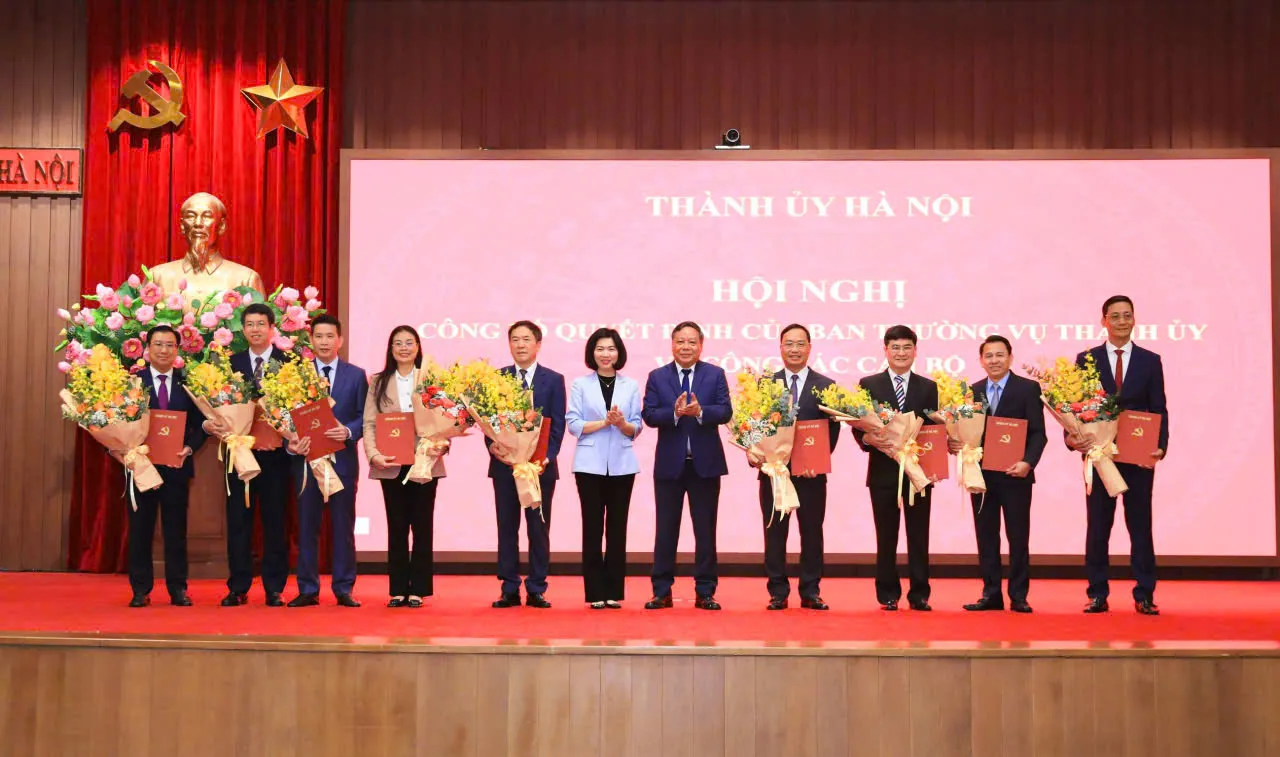 Phó Bí thư Thường trực Thành ủy Hà Nội Nguyễn Văn Phong và Chủ tịch HĐND thành phố Hà Nội Phùng Thị Hồng Hà trao quyết định và tặng hoa chúc mừng các cán bộ nhận nhiệm vụ mới