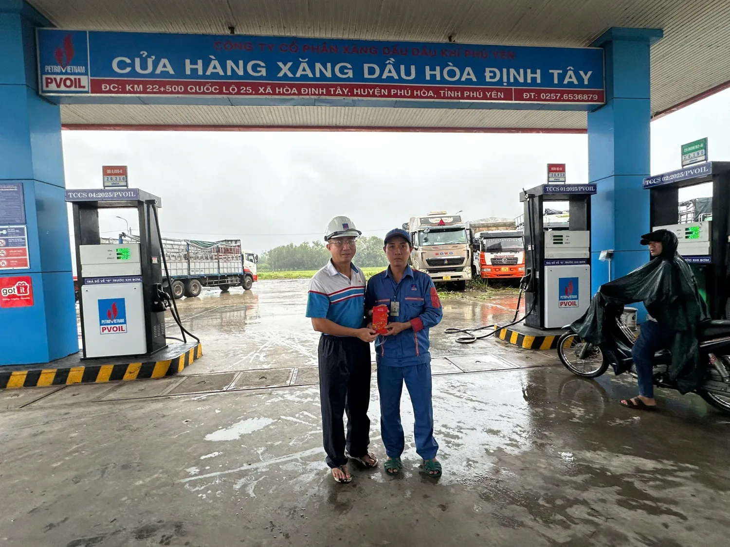 Giám đốc PVOIL Phú Yên trao thưởng cho anh Hồ Quốc Hưng - nhân viên CHXD Hòa Định Tây đã có hành động dũng cảm cứu người.
