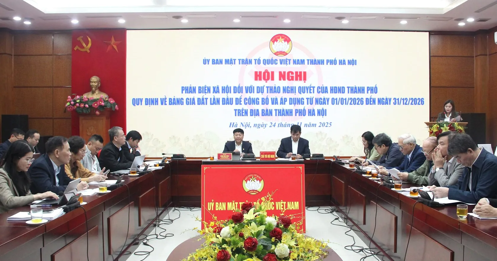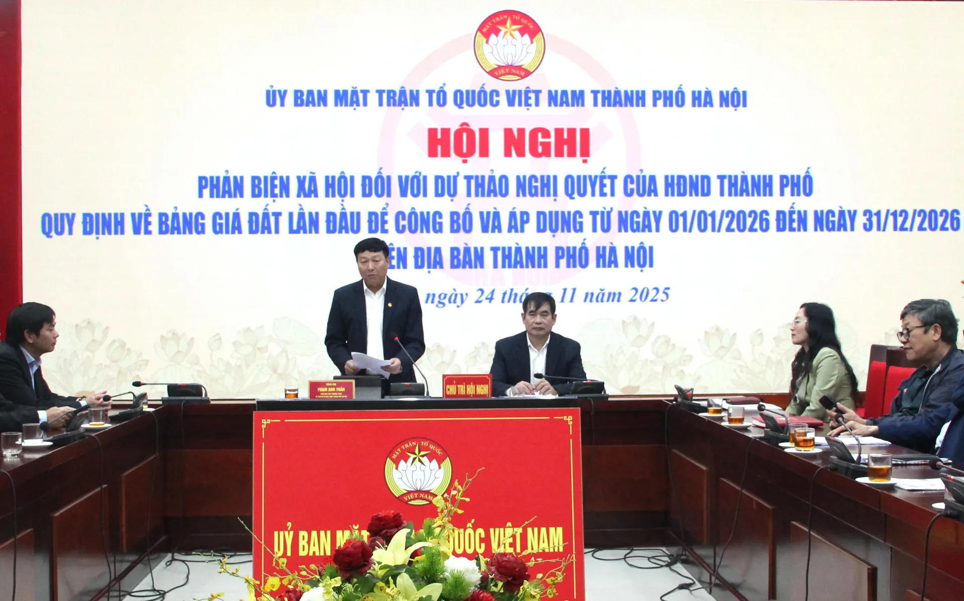 Hôm nay, 24/11, Ủy ban Mặt trận Tổ quốc (MTTQ) Việt Nam TP Hà Nội tổ chức Hội nghị phản biện xã hội đối với dự thảo Nghị quyết của HĐND TP quy định về bảng giá đất lần đầu để công bố và áp dụng từ ngày 1/1/2026 trên địa bàn TP Hà Nội.