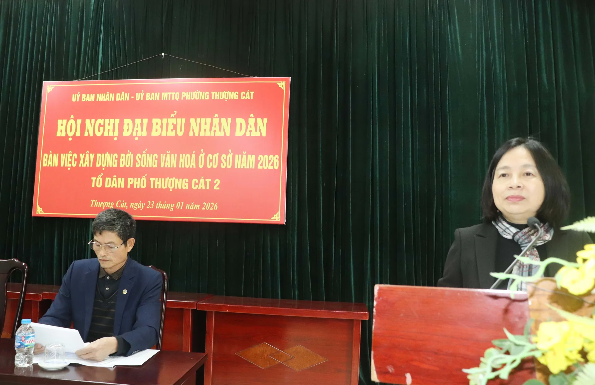 Kinhtedothi - Chiều 23/1, UBND phường Thượng Cát phối hợp Ủy ban MTTQ phường tổ chức Hội nghị đại biểu Nhân dân bàn việc xây dựng đời sống văn hoá ở cơ sở năm 2026 Tổ dân phố (TDP) Thượng Cát 2. Tới dự có Phó Bí thư Thường trực Đảng ủy phường Thượng Cát Nguyễn Thị Thuỷ; Chủ tịch Ủy ban MTTQ phường Thượng Cát Văn Thuý Hoa.