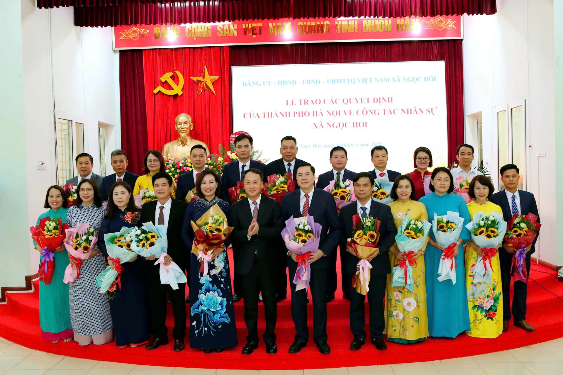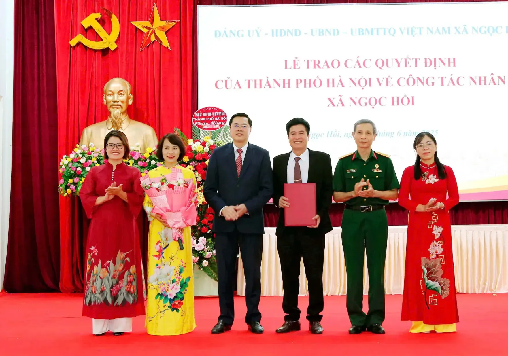 Thành ủy viên, Giám đốc Sở Nội vụ TP Hà Nội Trần Đình Cảnh trao Quyết định và tặng hoa Ban Chấp hành Đảng bộ và Ủy viên UBKT Đảng ủy xã Ngọc Hồi.