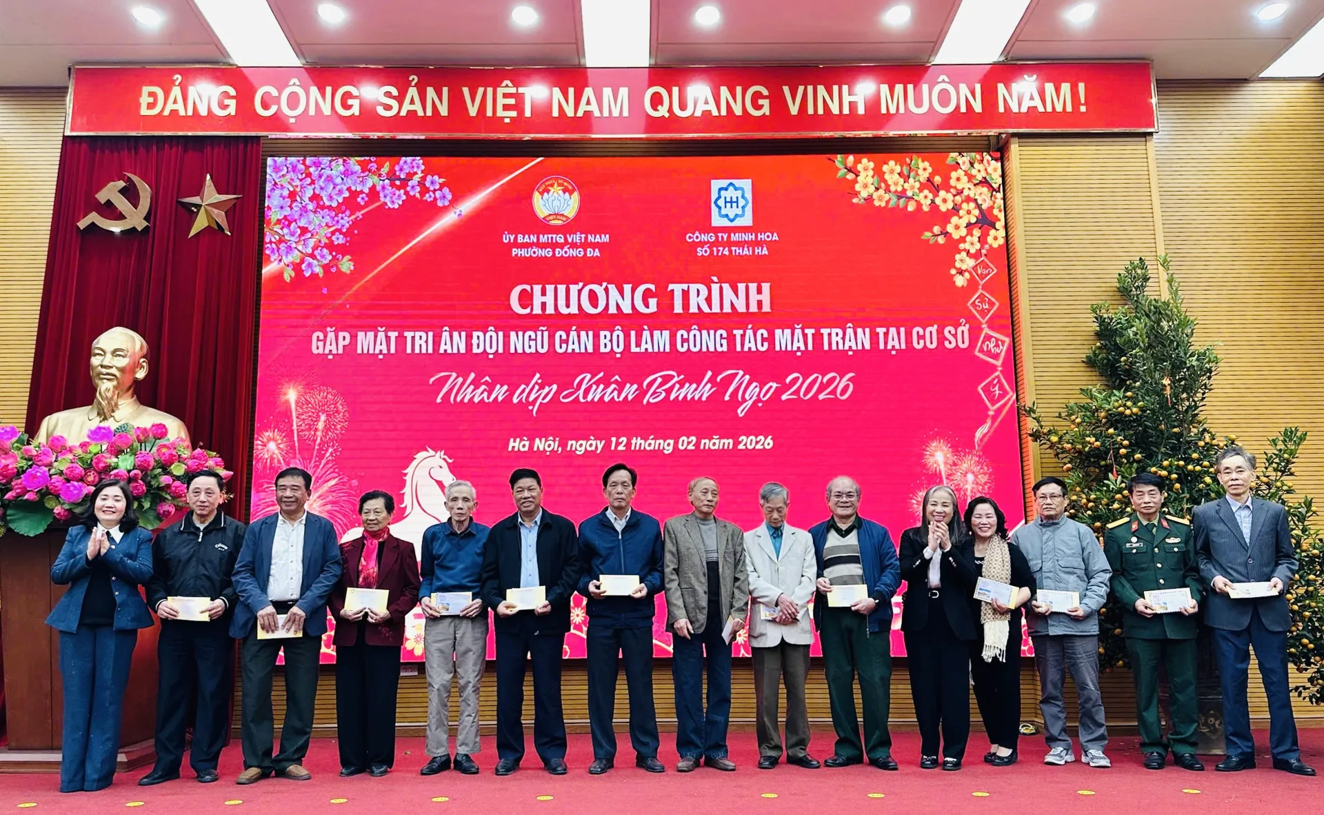 Kinhtedothi - Chiều 12/2, Ủy ban MTTQ Việt Nam phường Đống Đa phối hợp với Công ty Minh Hoa tổ chức gặp mặt tri ân, chúc Tết đội ngũ cán bộ làm công tác Mặt trận tại cơ sở nhân dịp Xuân Bính Ngọ 2026.