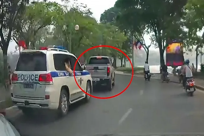 | Hình ảnh xe bán tải cản trở đoàn xe ưu tiên trên một đoạn đường dài. Ảnh cắt từ clip |