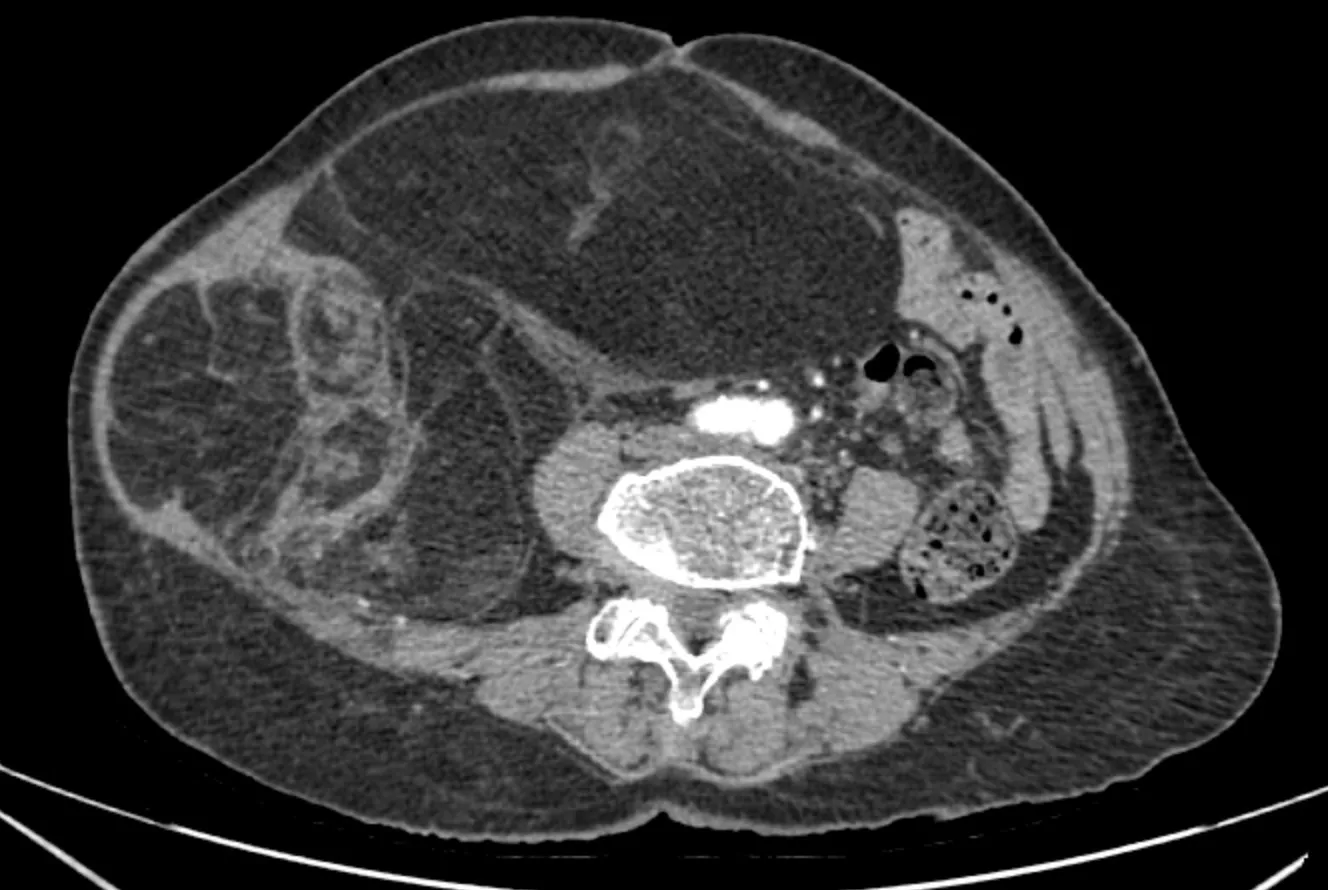 Bệnh nhân N.T.T được gia đình đưa vào Bệnh viện Ung Bướu Hà Nội do bụng to nhanh, căng tức, biến dạng vùng hạ sườn – mạn sườn phải trong khoảng 3 tháng gần đây. Nữ bệnh nhân có tiền sử viêm phổi mạn tính, thể trạng trung bình, không ghi nhận tiền sử ung thư. Bác sĩ khám lâm sàng phát hiện khối chắc, kích thước lớn, giới hạn tương đối rõ, di động hạn chế vùng hông – thắt lưng phải.