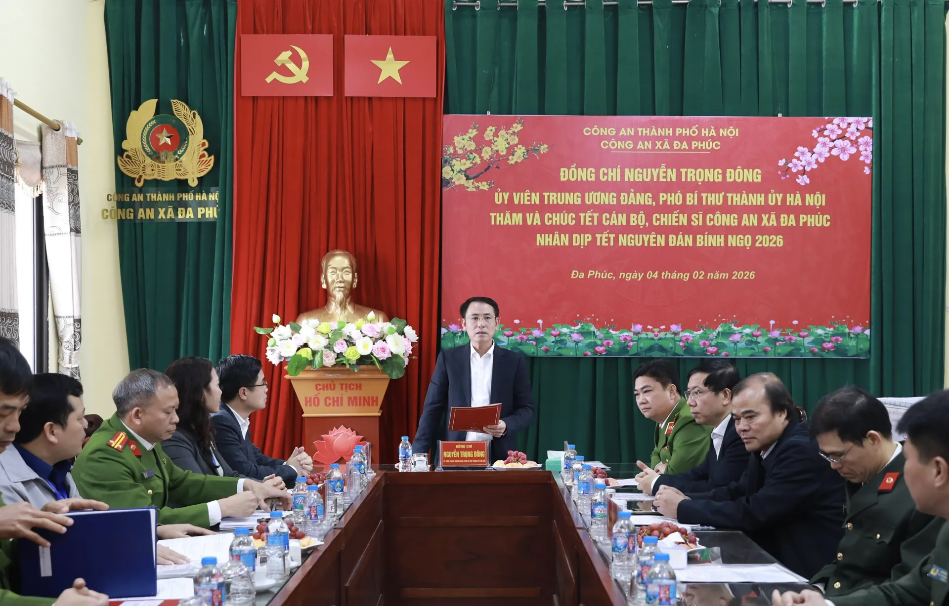Kinhtedothi - Ngày 4/2, Đoàn công tác của Thành ủy Hà Nội do Ủy viên Trung ương Đảng, Phó Bí thư Thành ủy Hà Nội Nguyễn Trọng Đông làm Trưởng đoàn đã đến thăm, chúc Tết, động viên cán bộ, chiến sĩ Công an xã Trung Giã và Công an xã Đa Phúc nhân dịp Tết Nguyên đán Bính Ngọ năm 2026.