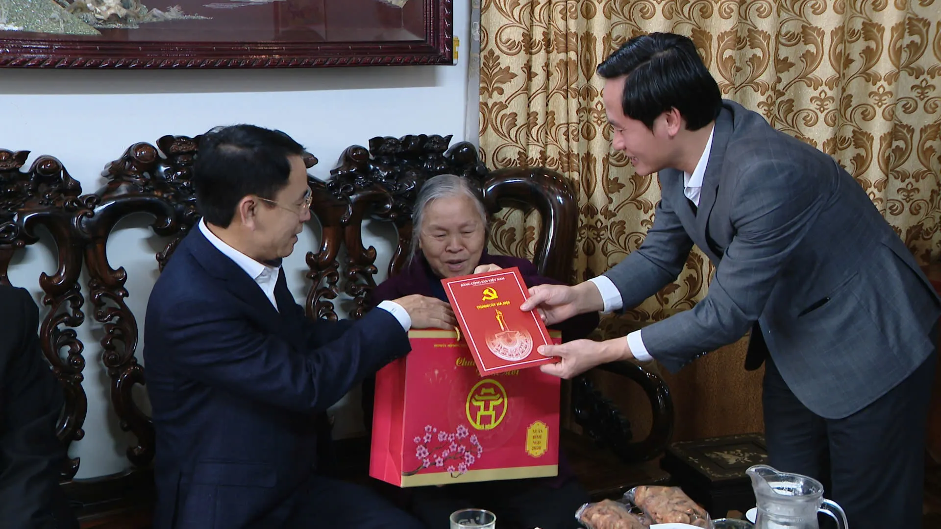 Đồng chí Nguyễn Trọng Đông - Uỷ viên T.Ư Đảng, Phó Bí thư Thành uỷ Hà Nội và đồng chí Hoàng Hải Đăng - Bí thư Đảng uỷ, Chủ tịch HĐND xã Phúc Thịnh thăm hỏi, tặng quà, chúc Tết bà Nguyễn Thị Mứt vợ của Anh hùng lực lượng vũ trang Nhân dân, liệt sĩ Lê Hữu Tựu.