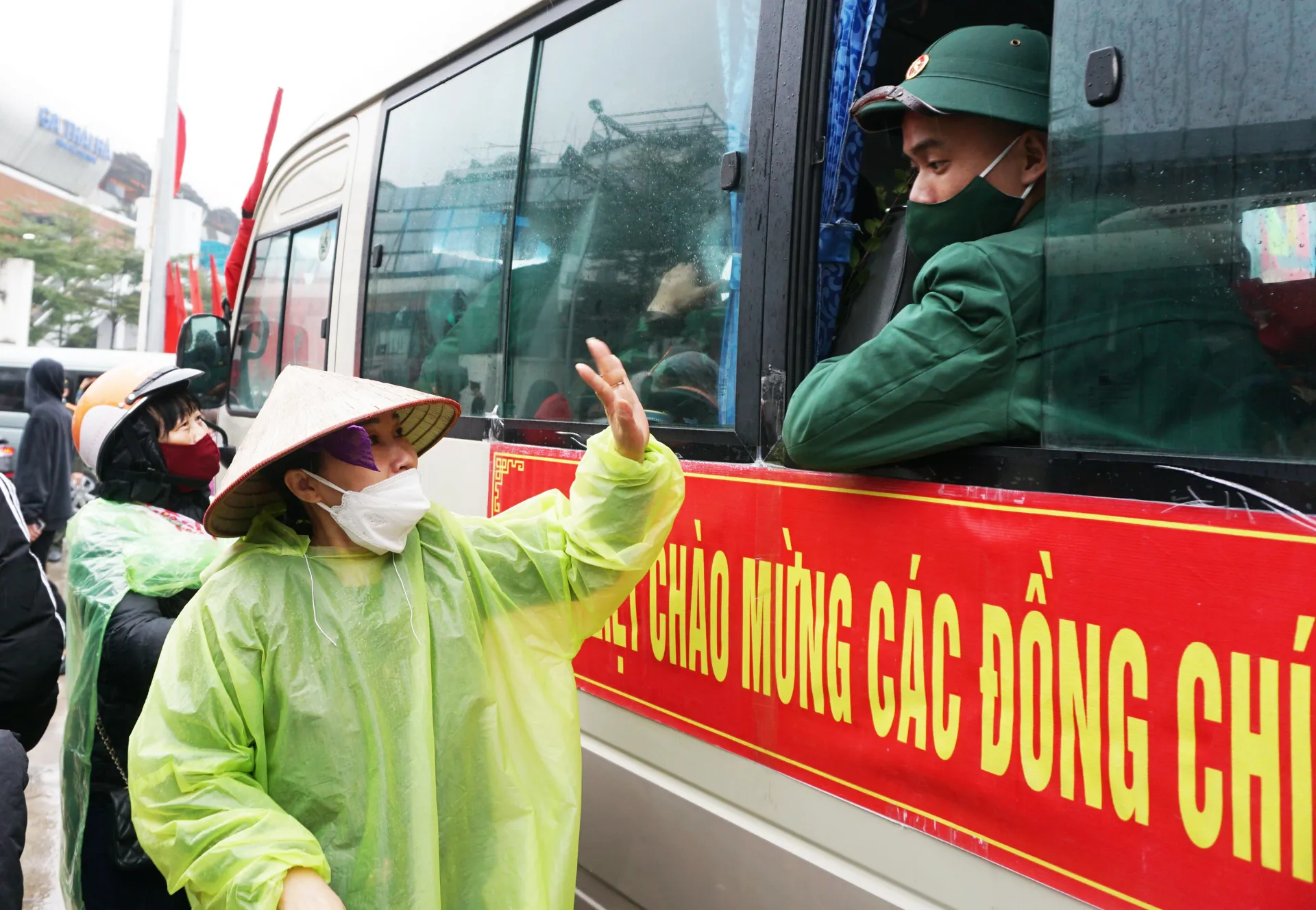 Người thân đội mưa tiễn các tân binh lên đường nhập ngũ