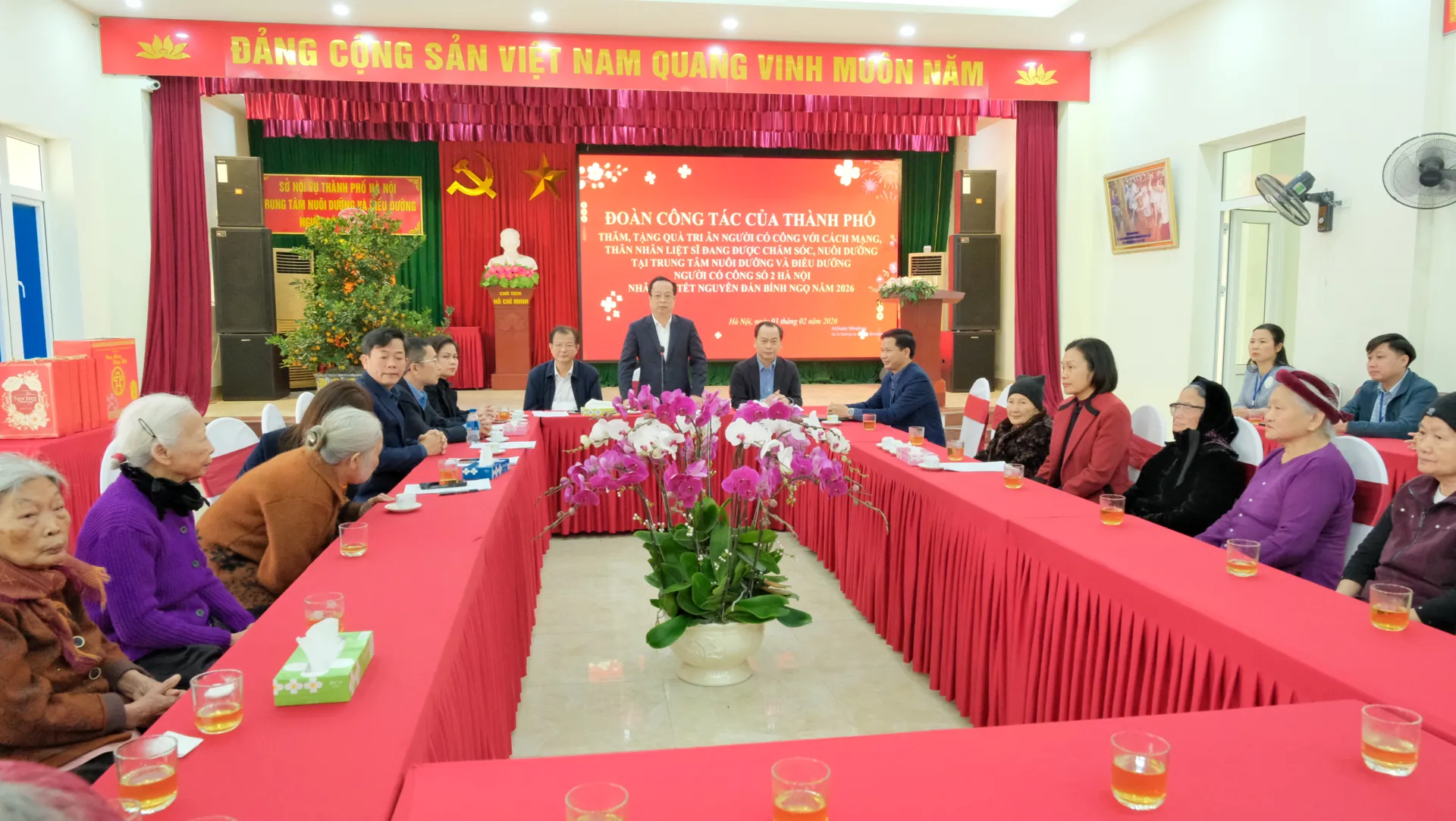 Cũng trong ngày 3/2, đoàn công tác đến thăm, chúc Tết tại Trung tâm nuôi dưỡng và điều dưỡng người có công số 2 ở xã Ứng Thiên. Trung tâm có nhiệm vụ nuôi dưỡng người có công với cách mạng đang hưởng trợ cấp ưu đãi hằng tháng và thân nhân liệt sĩ sống cô đơn, không nơi nương tựa hoặc có hoàn cảnh đặc biệt khó khăn; điều dưỡng phục hồi sức khỏe tập trung đối với người có công với cách mạng và thân nhân liệt sĩ đang hưởng trợ cấp ưu đãi hằng tháng.