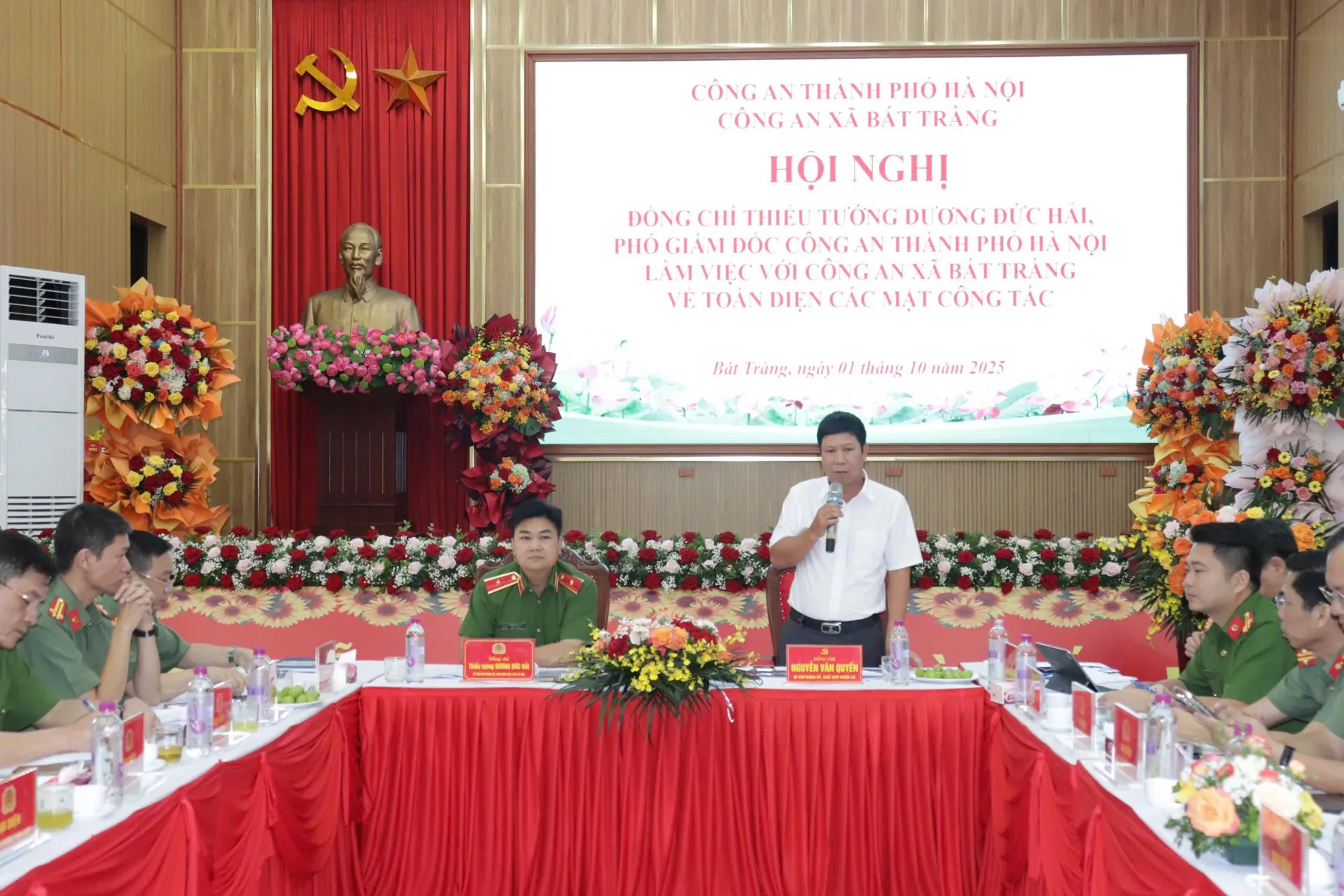 Phát biểu chỉ đạo, Phó Giám đốc Công an TP Hà Nội, Thiếu tướng Dương Đức Hải ghi nhận, biểu dương những kết quả mà Công an xã Bát Tràng đã đạt được, đồng thời yêu cầu đơn vị không chủ quan, lơ là mà phải chủ động, quyết liệt hơn nữa trong công tác. Đồng chí nhấn mạnh một số nhiệm vụ trọng tâm trong thời gian tới, đó là: Tập trung rà soát, kịp thời phát hiện và xử lý nghiêm các hành vi vi phạm pháp luật, không để hình thành tụ điểm phức tạp về an ninh trật tự. Đẩy mạnh tuyên truyền, nâng cao nhận thức pháp luật cho Nhân dân, khơi dậy tinh thần cảnh giác và trách nhiệm tham gia giữ gìn trật tự tại cộng đồng. Tiếp tục cải cách thủ tục hành chính, nâng cao thái độ, tinh thần phục vụ Nhân dân, lấy sự hài lòng của người dân làm thước đo. Quan tâm xây dựng lực lượng công an xã chính quy, tinh nhuệ, trong sạch, vững mạnh, đủ sức đáp ứng yêu cầu nhiệm vụ trong giai đoạn hiện nay.