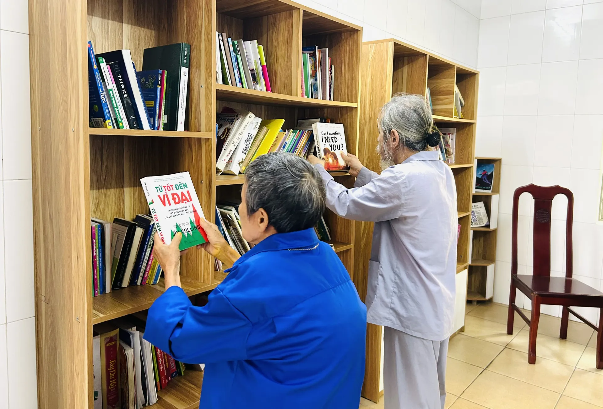 Phòng đọc sách bắt đầu hoạt động từ ngày 7/6/2025, với nhiều cuốn sách được sắp xếp gọn gàng, ngăn nắp trên các giá sách. Chị Phùng Thị Hương – Phó Trưởng phòng Tiếp nhận quản lý và chăm sóc đối tượng thuộc Trung tâm chia sẻ, sách ở đây do cán bộ đơn vị và các nhà từ thiện mang đến ủng hộ. Phòng đọc sách mở cửa vào thứ Tư và thứ Bảy hàng tuần (buổi sáng hoặc chiều) để bà con đến lựa chọn sách đọc ngay tại chỗ hoặc mang về phòng. Ngoài ra, nơi này còn được mở cửa vào các buổi tối từ thứ Hai đến Chủ nhật để bà con đọc sách, sử dụng máy tính để truy cập internet. Người lớn thì đọc những quyển sách về lịch sử, trang bị kỹ năng sống. Trong khi đó, trẻ em, thanh thiếu niên thích đọc những cuốn truyện tranh. Mỗi buổi có khoảng hơn hai chục người đến đọc sách và sử dụng máy tính.
