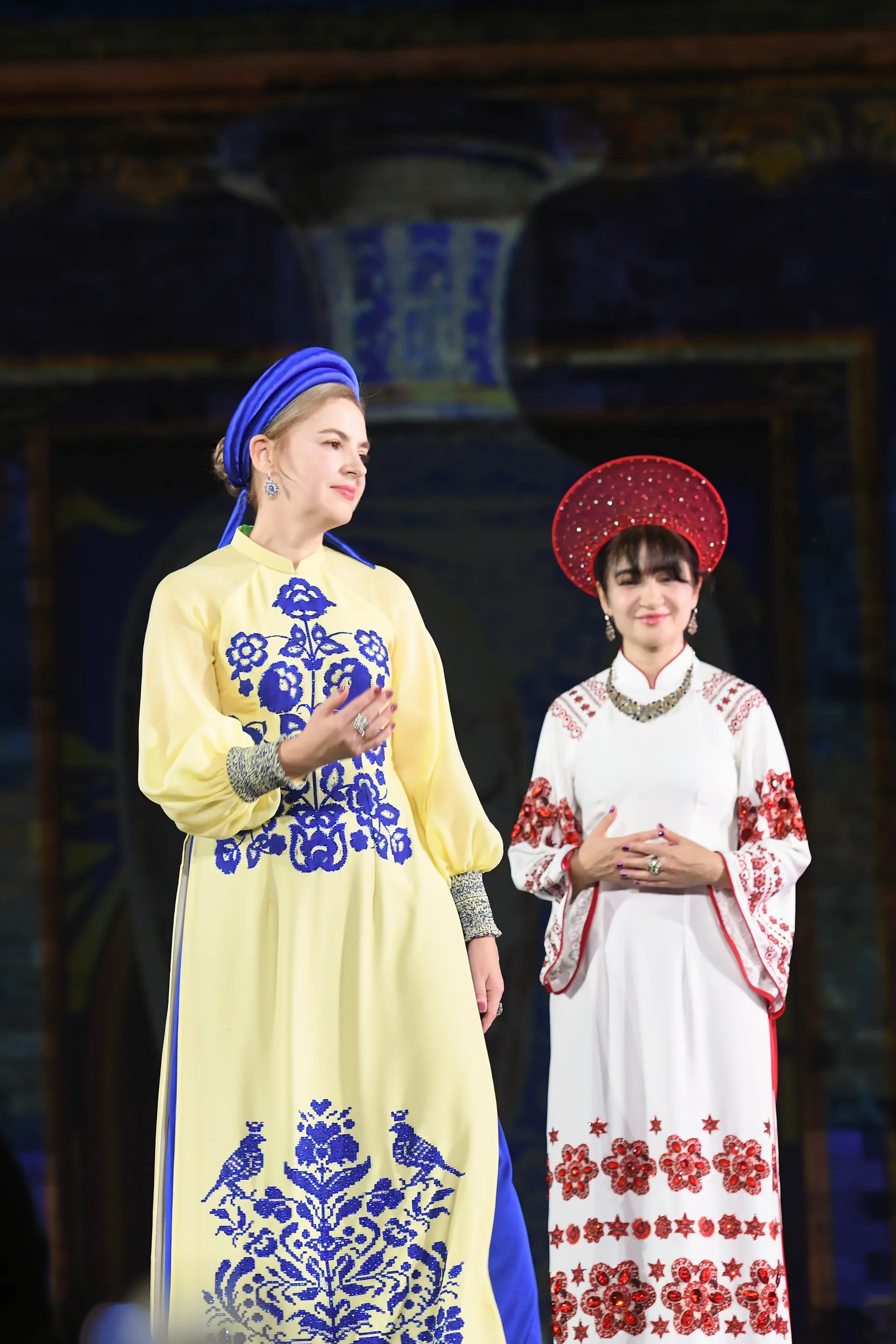 Kinhtedothi - Tối 11/10, sân khấu Hoàng Thành Thăng Long như được thổi hồn bởi vẻ đẹp giao hòa giữa văn hóa Việt Nam và thế giới, khi bốn phu nhân đại sứ Cộng hòa Séc, Nhật Bản, Ukraine và Hoa Kỳ cùng xuất hiện trong tà áo dài thướt tha của nhà thiết kế Anh Thư của thương hiệu Áo dài Ngân An.