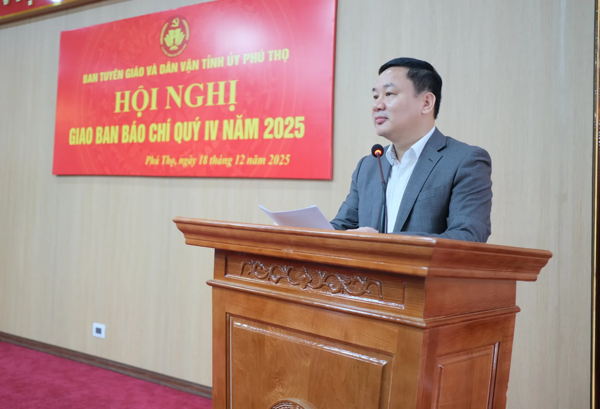 Kinhtedothi - Sáng 18/12, Ban Tuyên giáo và Dân vận Tỉnh ủy Phú Thọ tổ chức hội nghị giao ban báo chí quý IV/2025 nhằm đánh giá kết quả công tác thông tin, tuyên truyền trong năm và định hướng nhiệm vụ thời gian tới.