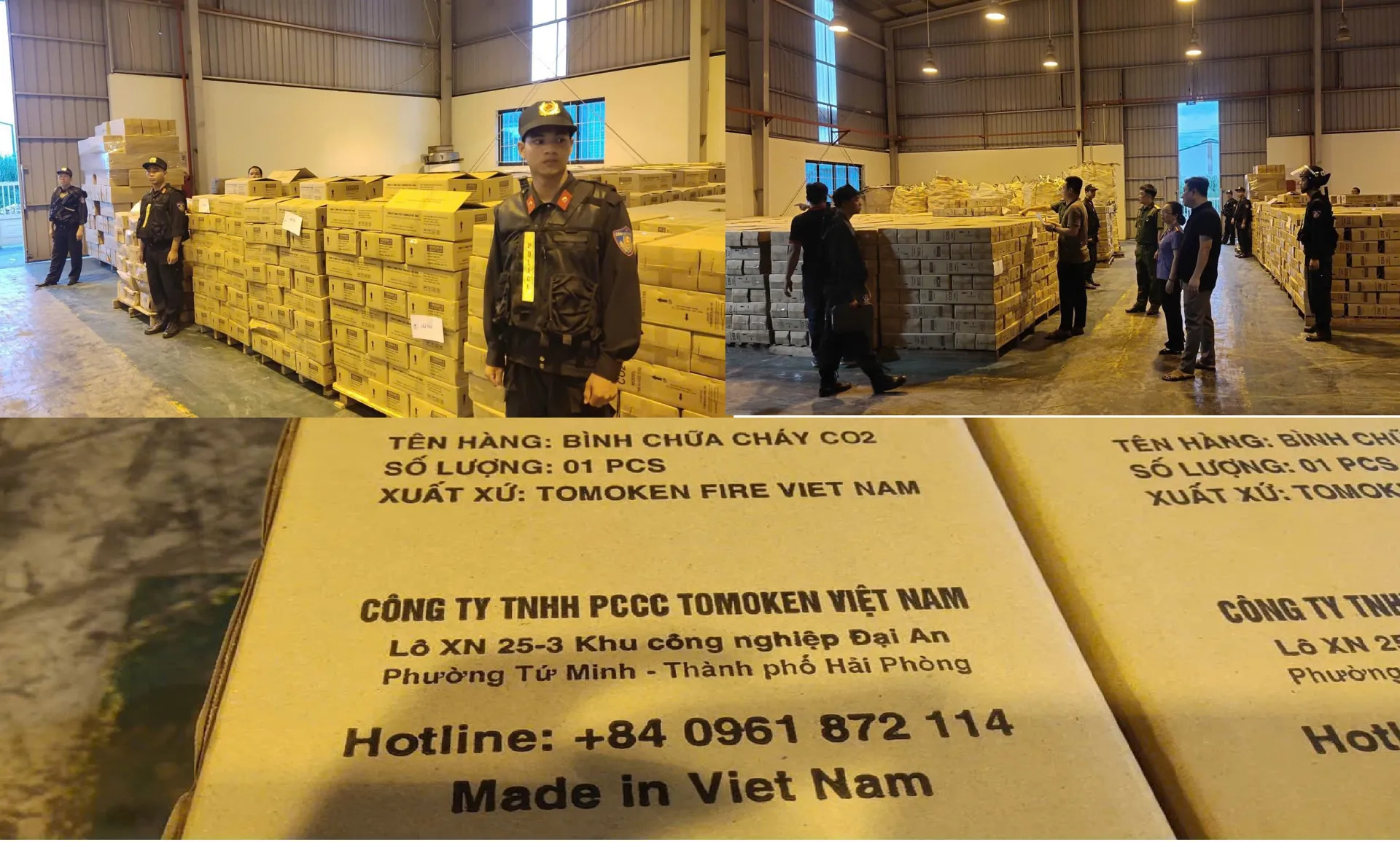 Lực lượng chức năng phát hiện số lượng rất lớn sản phẩm bình chữa cháy giả tại kho hàng của Công ty TNHH TOMOKEN Việt Nam. Ảnh: Công an Phú Thọ.