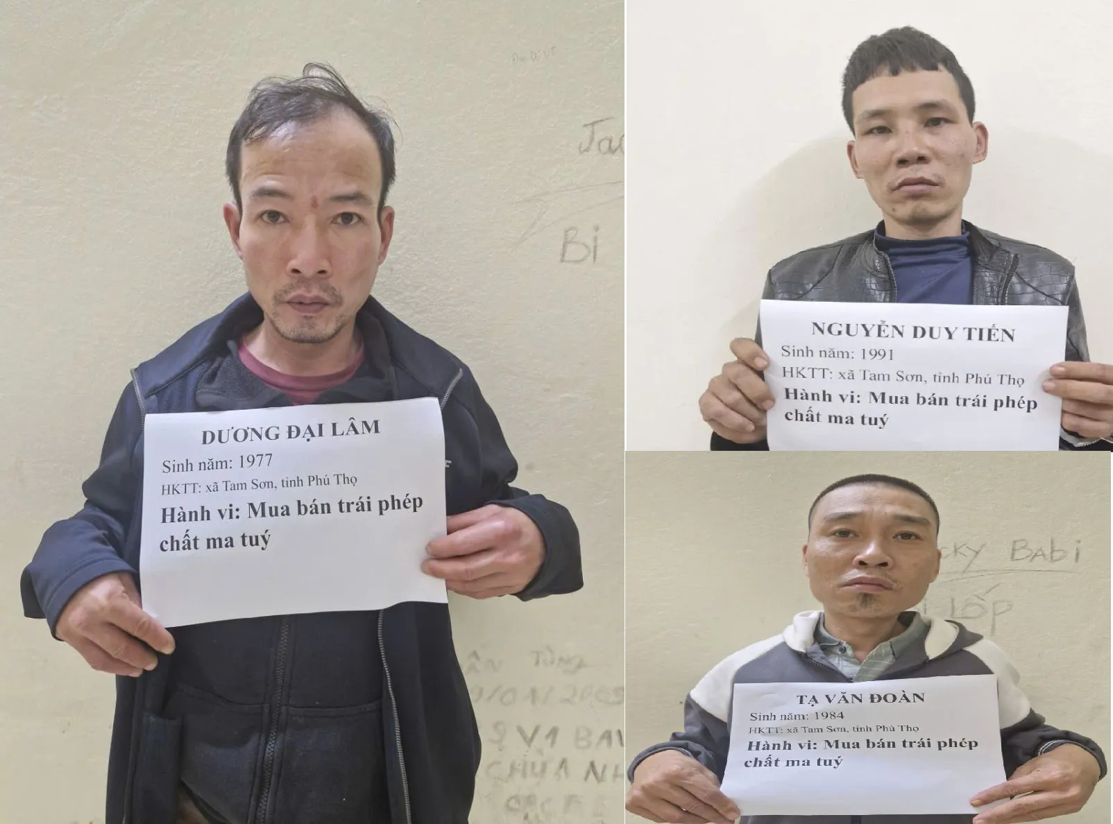 Cùng ngày, vào khoảng 16 giờ, Phòng Cảnh sát điều tra tội phạm về ma túy tiếp tục bắt quả tang Tạ Văn Đoàn (SN 1984, trú tại thôn Ngọc Sơn, xã Tam Sơn) khi đang mua bán trái phép chất ma túy tại thôn Văn Sơn, xã Lập Thạch. Tang vật thu giữ gồm 8 gói heroin, khối lượng 0,991 gam và 2 điện thoại di động.