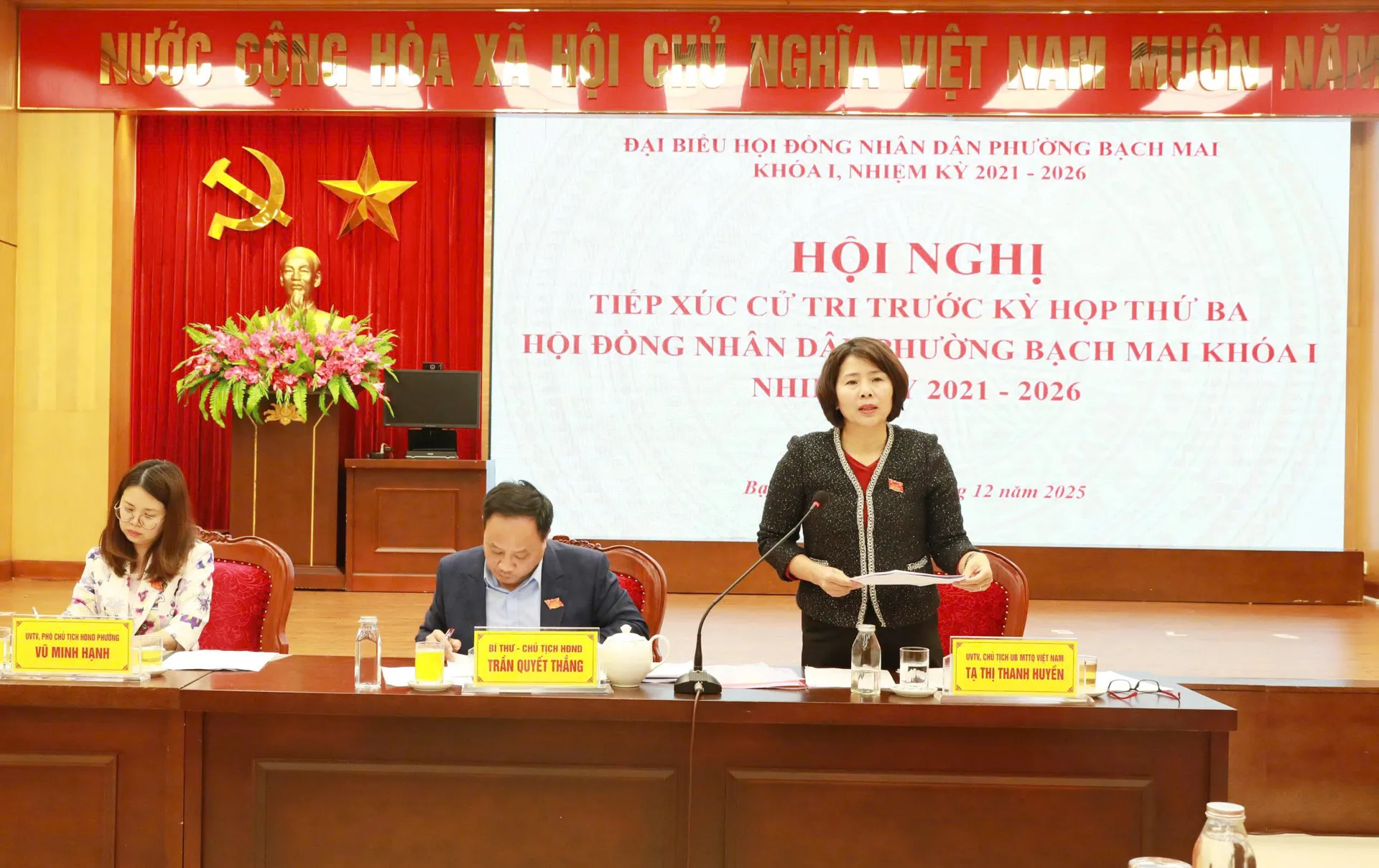 Tại đây, Ủy viên Ban Thường vụ Đảng ủy, Phó Chủ tịch UBND phường Bạch Mai Nguyễn Thị Ngọc Anh đã trình bày báo cáo của UBND phường về tình hình thực hiện kế hoạch phát triển KT-XH năm 2025 và dự kiến kế hoạch phát triển KT-XH năm 2026 của phường; Ủy viên Ban Thường vụ Đảng ủy, Phó Chủ tịch UBND phường Bạch Mai Nguyễn Hoành Dũng thông tin tổng hợp trả lời ý kiến cử tri phường tại Hội nghị tiếp xúc cử tri chuyên đề của HĐND phường năm 2025.
