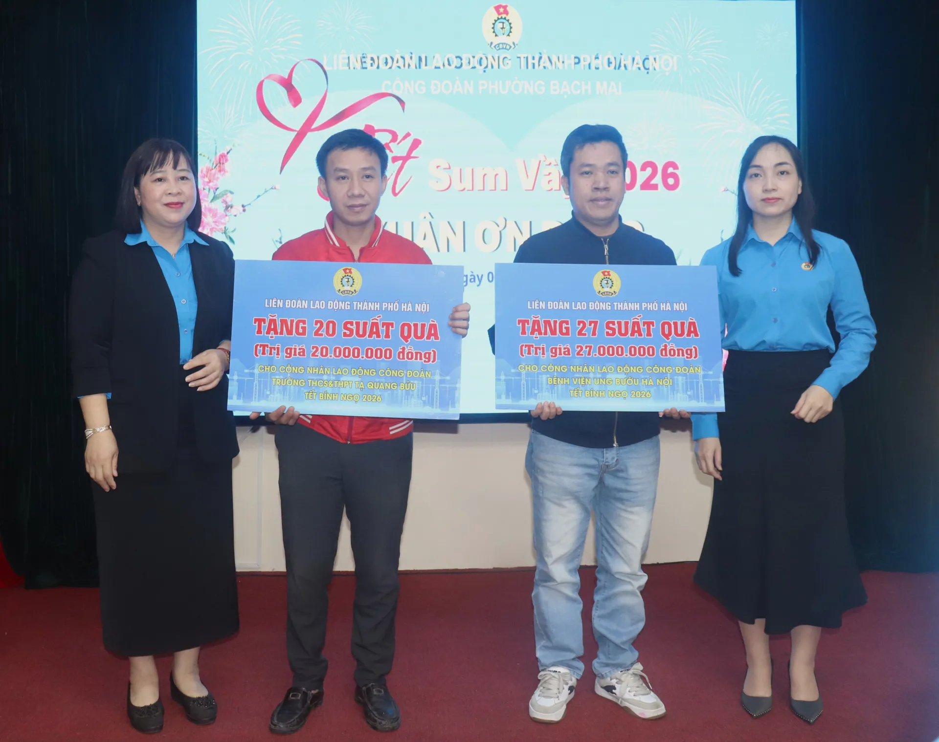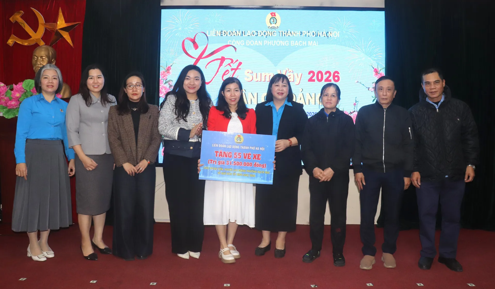 Tại Chương trình “Tết sum vầy - Xuân ơn Đảng” hôm nay, lãnh đạo Công đoàn phường Bạch Mai đã trực tiếp trao tới 20 công đoàn cơ sở các suất quà của Liên đoàn Lao động TP hỗ trợ NLĐ dịp Tết, trao vé xe cho NLĐ về quê ăn Tết tới 11 công đoàn cơ sở và trao 20 túi quà Tết, voucher tới các đoàn viên Công đoàn, NLĐ có hoàn cảnh khó khăn trên địa bàn.