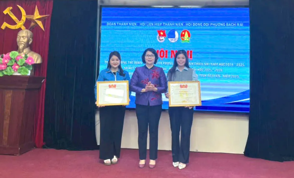 Trưởng Ban Công tác Đoàn và thanh thiếu nhi - Thành Đoàn Hà Nội Phạm Minh Phúc và Chủ tịch Ủy ban MTTQ Việt Nam phường Bạch Mai Tạ Thị Thanh Huyền khen thưởng các tập thể, cá nhân có thành tích xuất sắc