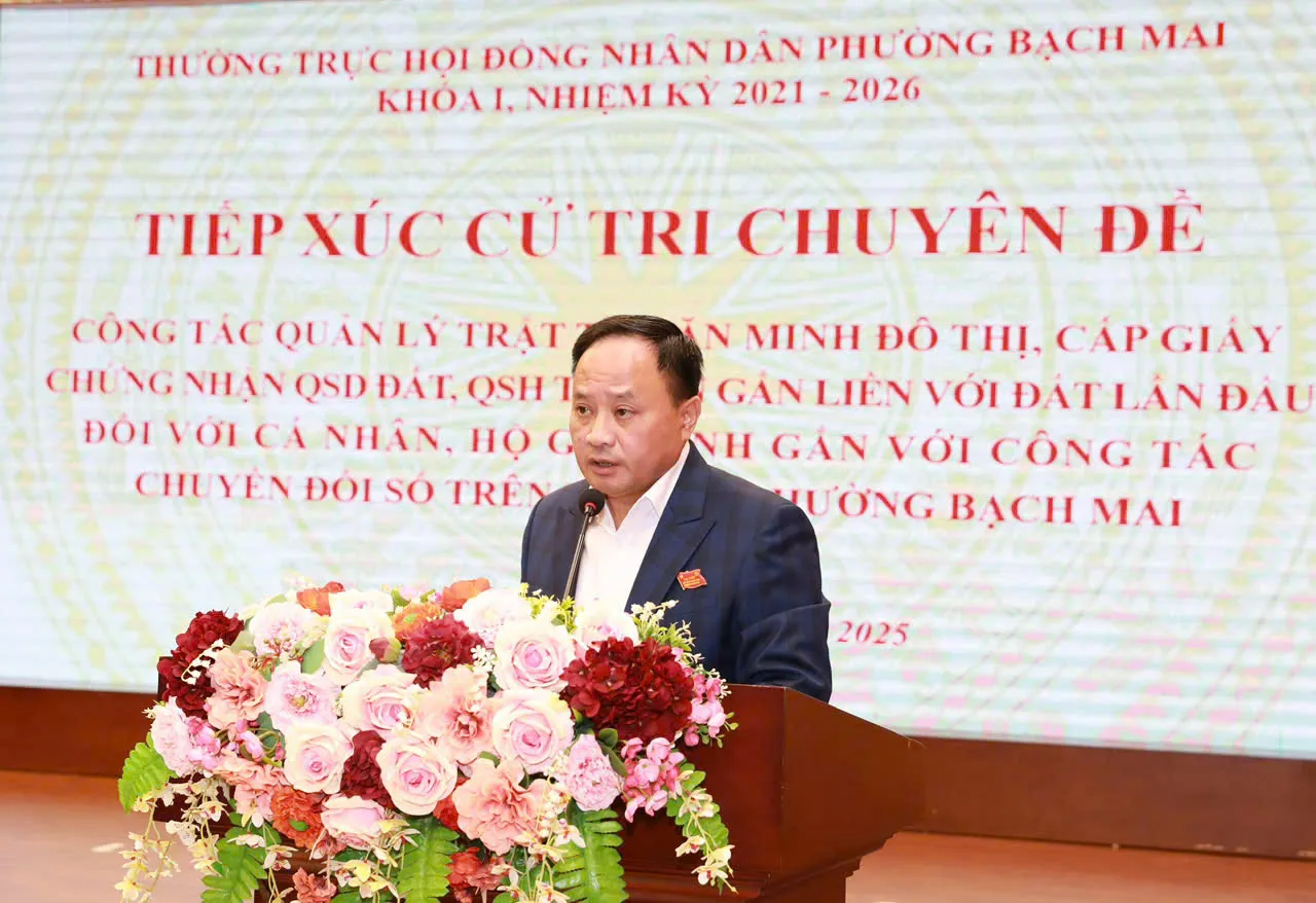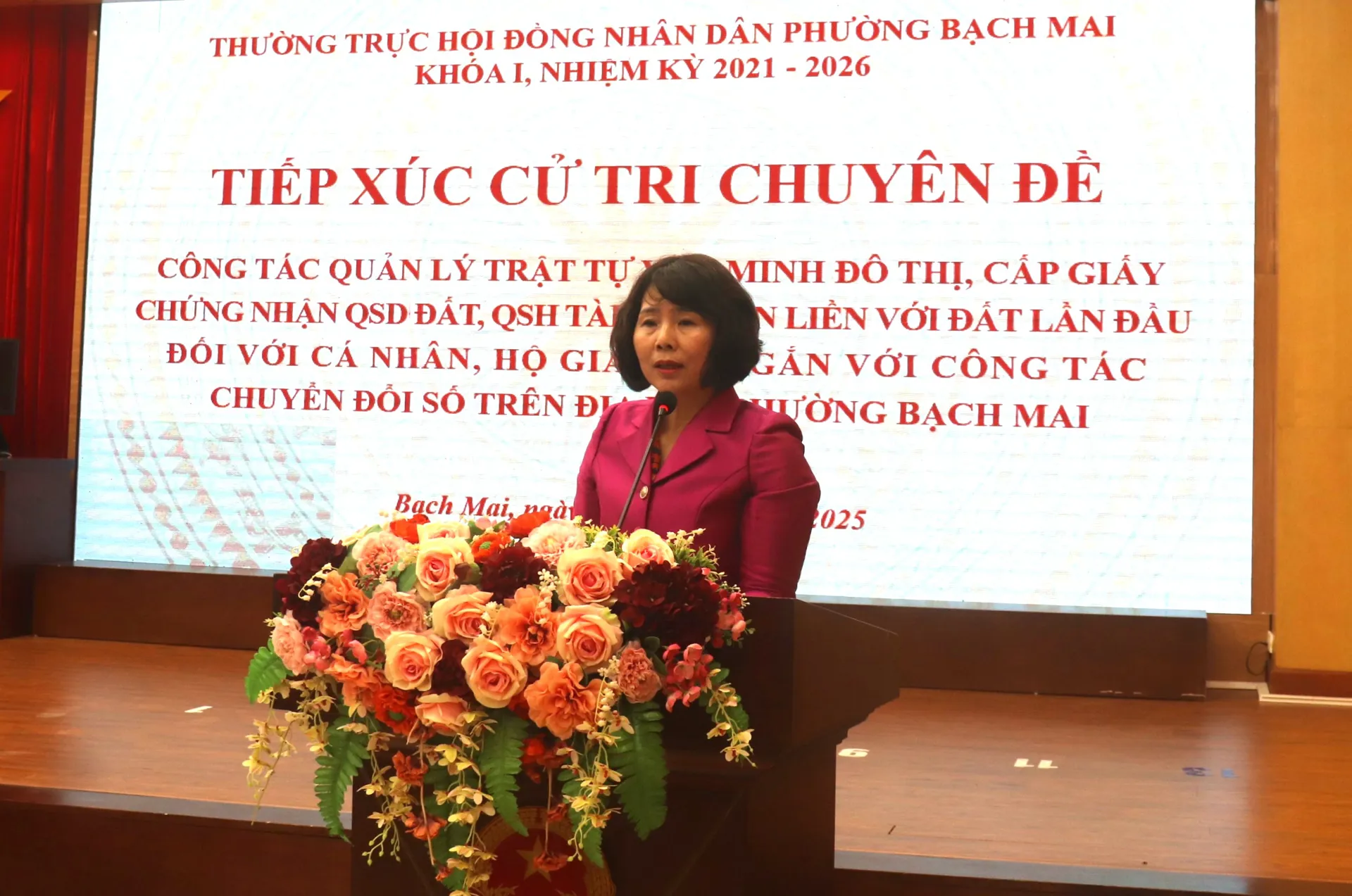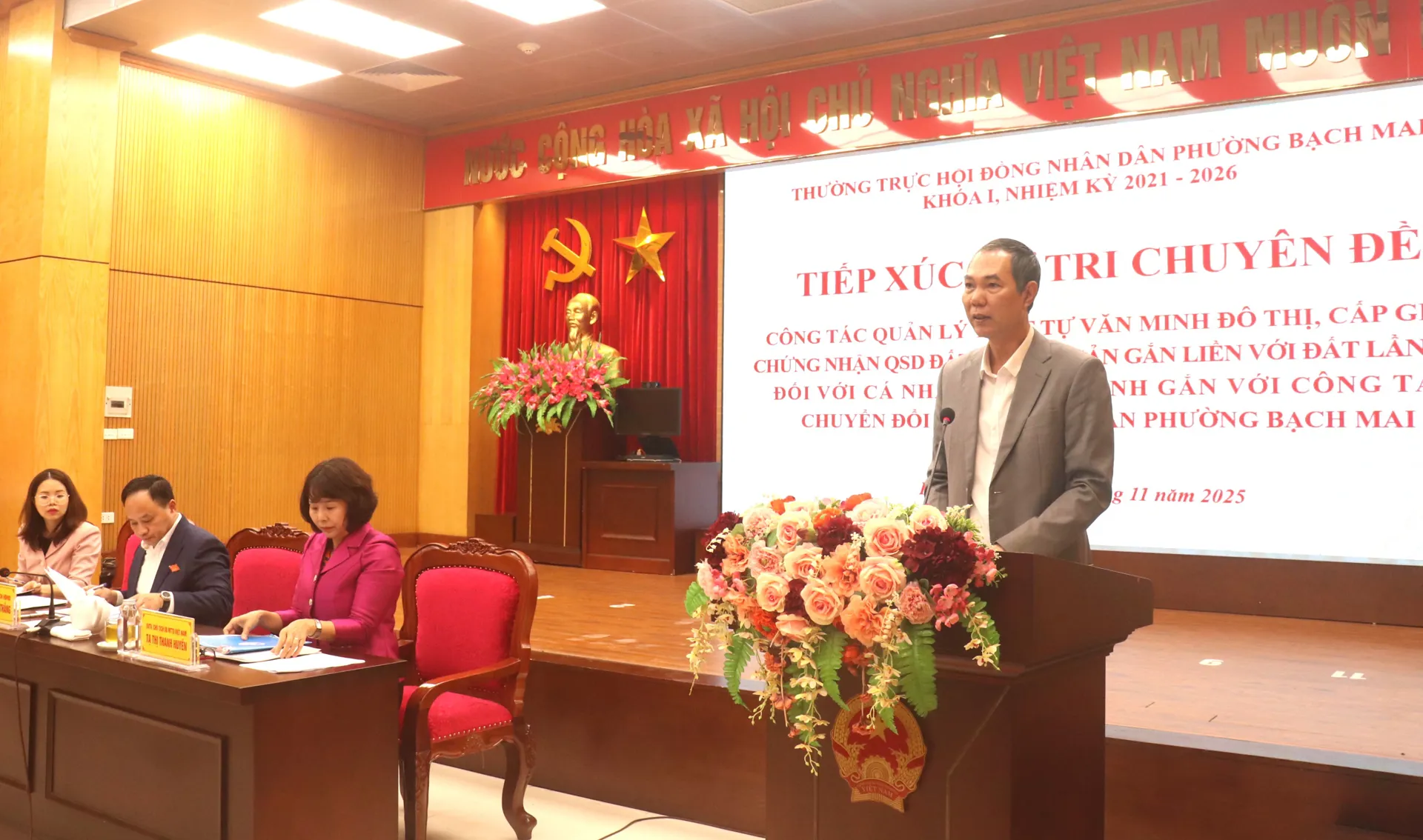 Chiều nay, 4/11, HĐND phường Bạch Mai tổ chức Hội nghị Tiếp xúc cử tri chuyên đề về công tác quản lý trật tự văn minh đô thị (TTVMĐT), cấp Giấy chứng nhận (GCN) quyền sử dụng đất, quyền sở hữu tài sản gắn liền với đất lần đầu đối với cá nhân, hộ gia đình gắn với công tác chuyển đổi số trên địa bàn phường.