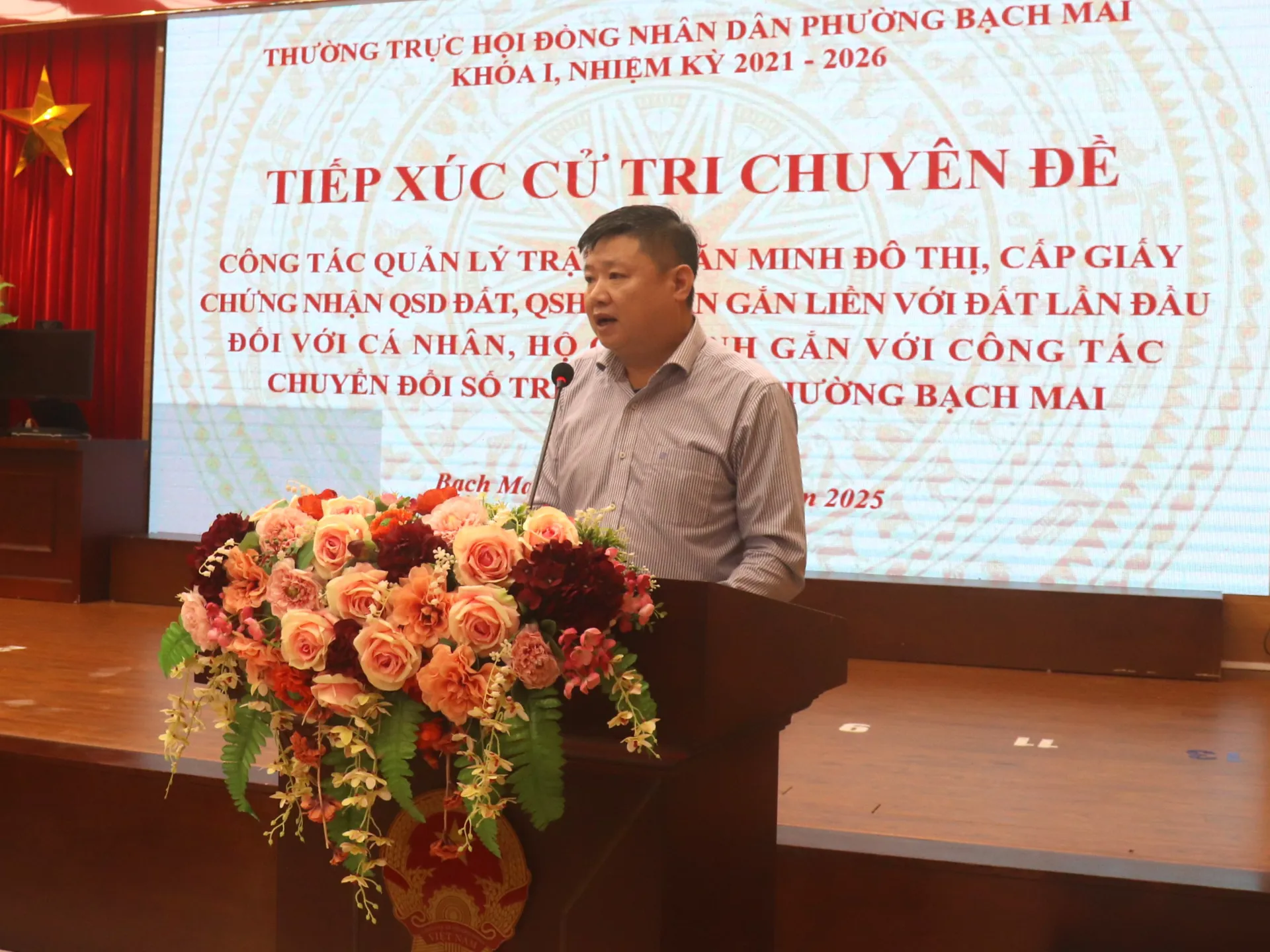 Tại Hội nghị, Ủy viên Ban Thường vụ Đảng ủy, Phó Chủ tịch UBND phường Bạch Mai Nguyễn Hoành Dũng đã thông tin về tình hình công tác quản lý TTVMĐT, cấp GCN quyền sử dụng đất, quyền sở hữu tài sản gắn liền với đất lần đầu đối với cá nhân, hộ gia đình gắn với công tác chuyển đổi số trên địa bàn phường. Trưởng Phòng Kinh tế, Hạ tầng và Đô thị phường Bạch Mai Ninh Anh Hải báo cáo trả lời cụ thể 33 lượt ý kiến, kiến nghị của cử tri phường được tổng hợp trước Hội nghị này, cùng một số ý kiến đã nêu tại Hội nghị tiếp xúc, đối thoại giữa người đứng đầu cấp ủy, chính quyền phường với MTTQ và các tổ chức CT-XH, Nhân dân trên địa bàn cuối tháng 10/2025.
