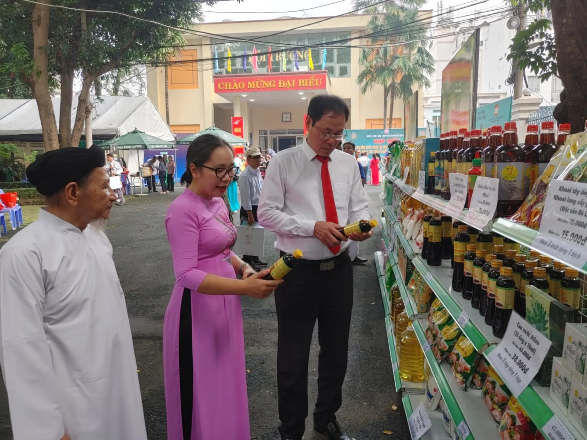 Phó Chủ tịch Ủy ban MTTQ Việt Nam TP Hồ Chí Minh, Chủ tịch Hội Nông dân TP Nguyễn Thành Trung và Chủ tịch Ủy ban MTTQ phường Bình Thạnh Hoàng Mai Quỳnh Hoa tại gian hàng trợ giá.