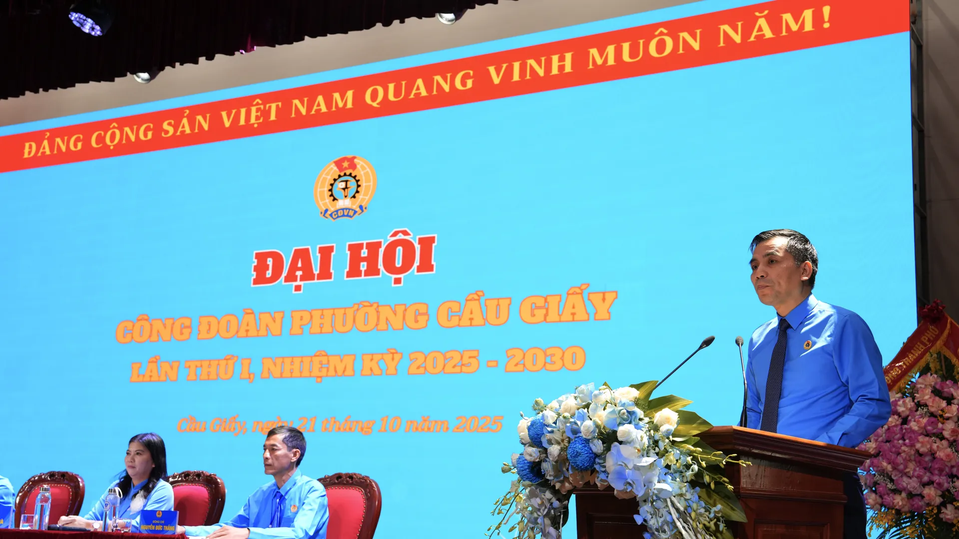 Phát biểu tại Đại hội, đồng chí Lê Đình Hùng - Phó Chủ tịch phụ trách Liên đoàn Lao động TP Hà Nội biểu dương tinh thần chủ động, sáng tạo của Công đoàn phường Cầu Giấy trong thời gian qua. Đồng chí nhấn mạnh: “Công đoàn phường cần phát huy vai trò đại diện, chăm lo và bảo vệ quyền, lợi ích hợp pháp, chính đáng của người lao động; đẩy mạnh chuyển đổi số, sử dụng hiệu quả mạng xã hội để nắm bắt tâm tư, nguyện vọng đoàn viên, tăng cường đồng thuận xã hội và tham mưu kịp thời cho cấp ủy, chính quyền”.