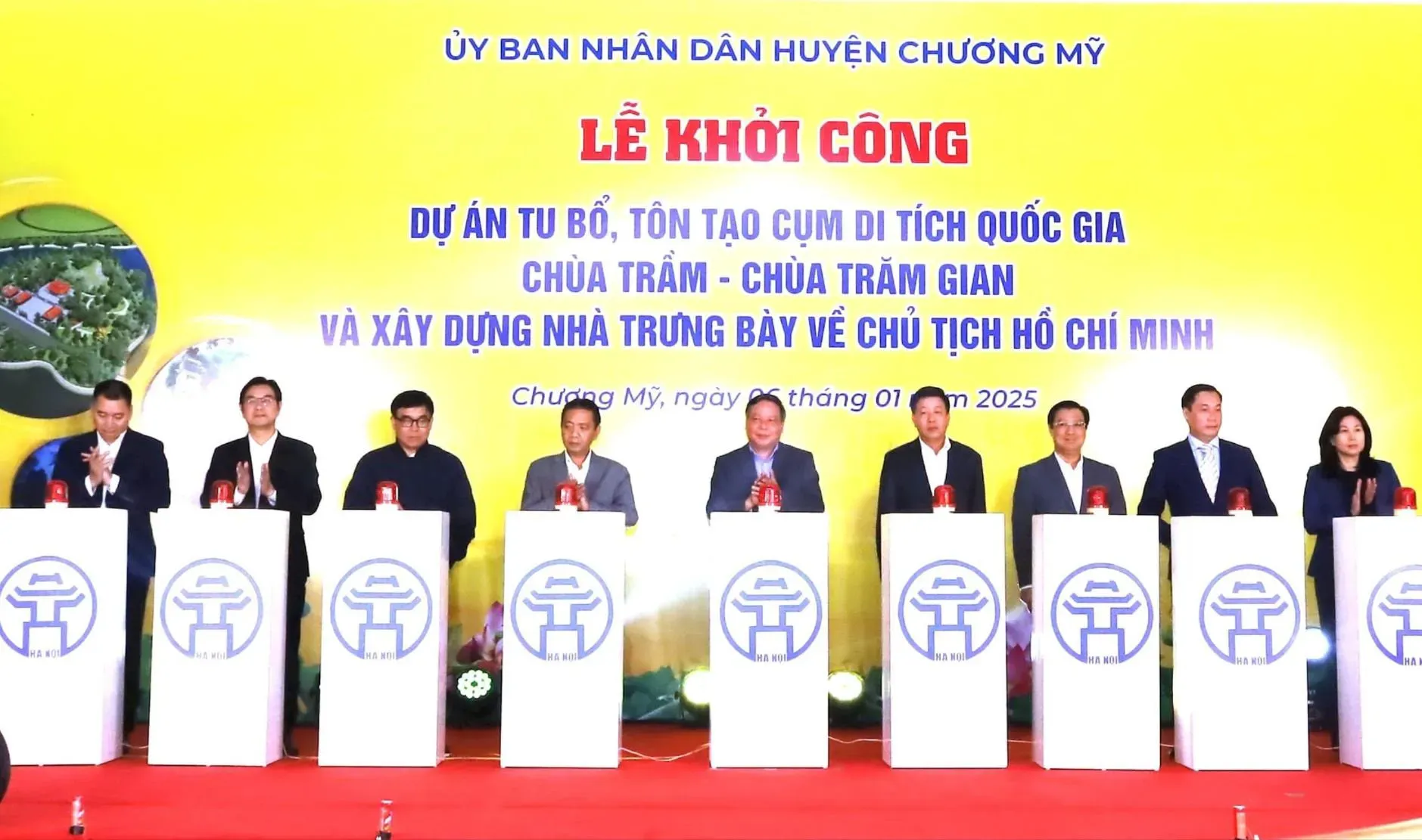 Lãnh đạo Trung ương và TP Hà Nội tại lễ khởi công Dự án tu bổ Cụm di tích Quốc gia chùa Trầm hôm 6/1/2025 (ảnh tư liệu).