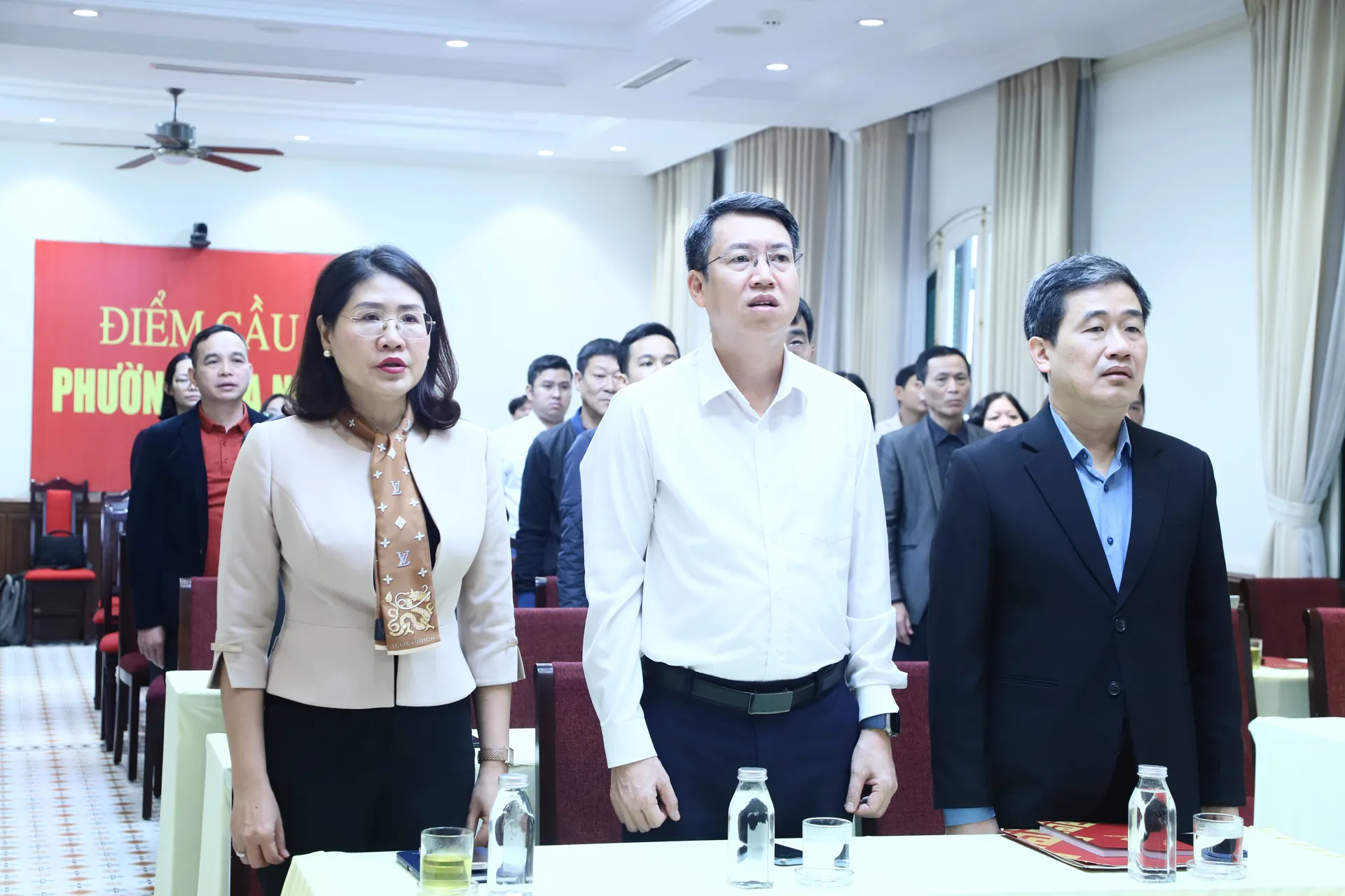 Bí thư Đảng ủy, Chủ tịch HĐND phường Cửa Nam Nguyễn Hoàng Trường, Phó Bí thư Thường trực Đảng ủy phường Phạm Thị Thu Thủy và Chủ tịch UBND phường Nguyễn Quốc Hoàn cùng các đại biểu thực hiện nghi lễ chào cờ.