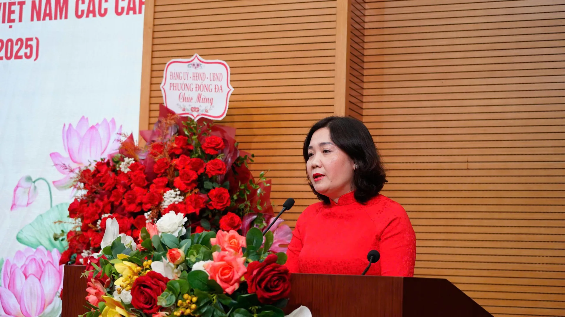 Chủ tịch Ủy ban MTTQ Việt Nam phường Đống Đa Trần Thị Minh Xuân trình bày diễn văn ôn lại truyền thống vẻ vang của MTTQ Việt Nam trong suốt 95 năm qua.