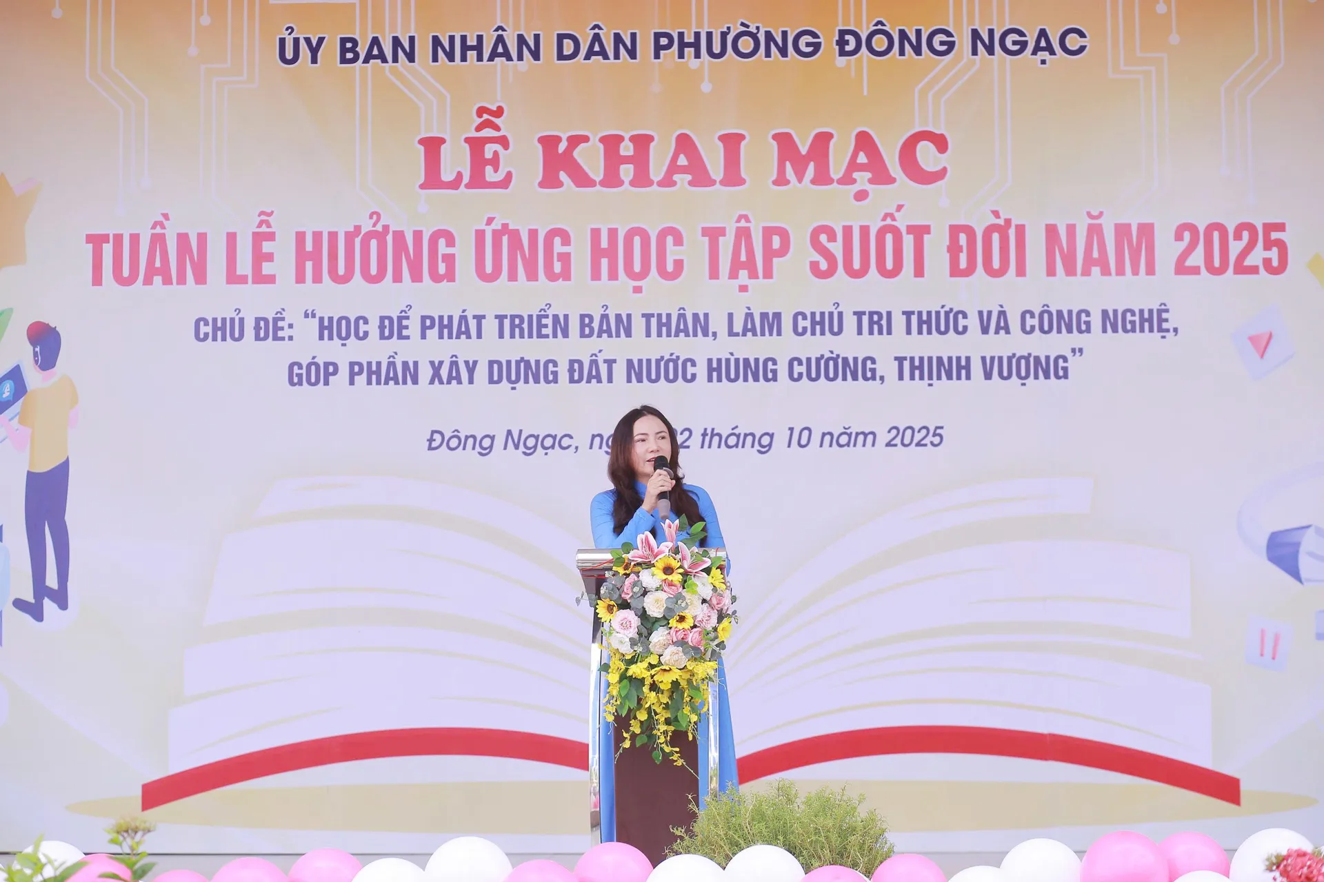Phát biểu khai mạc tại lễ hưởng ứng, Phó Chủ tịch UBND phường Đông Ngạc Nguyễn Thị Hương nhấn mạnh, năm nay, chủ đề của Tuần lễ hưởng ứng học tập suốt đời không chỉ là một lời nhắc nhở đầy ý nghĩa còn là lời khẳng định về vai trò thiết yếu của việc học tập thường xuyên, học tập suốt đời trong Kỷ nguyên mới – thời kỳ đất nước đang bước vào giai đoạn phát triển mạnh mẽ về KHCN, trí tuệ nhân tạo và chuyển đổi số toàn diện.