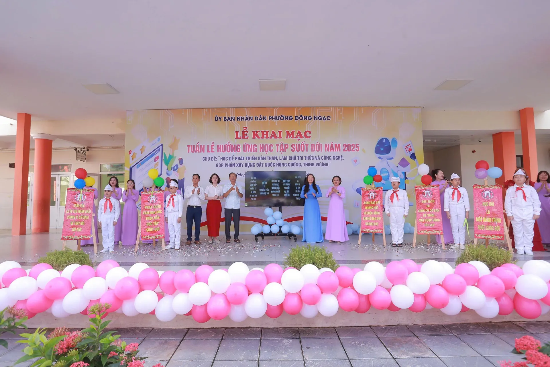 Lãnh đạo phường Đông Ngạc và trường Tiểu học Cổ Nhuế 2A thực hiện nghi thức khai mạc Tuần lễ hưởng ứng học tập suốt đời 2025.
