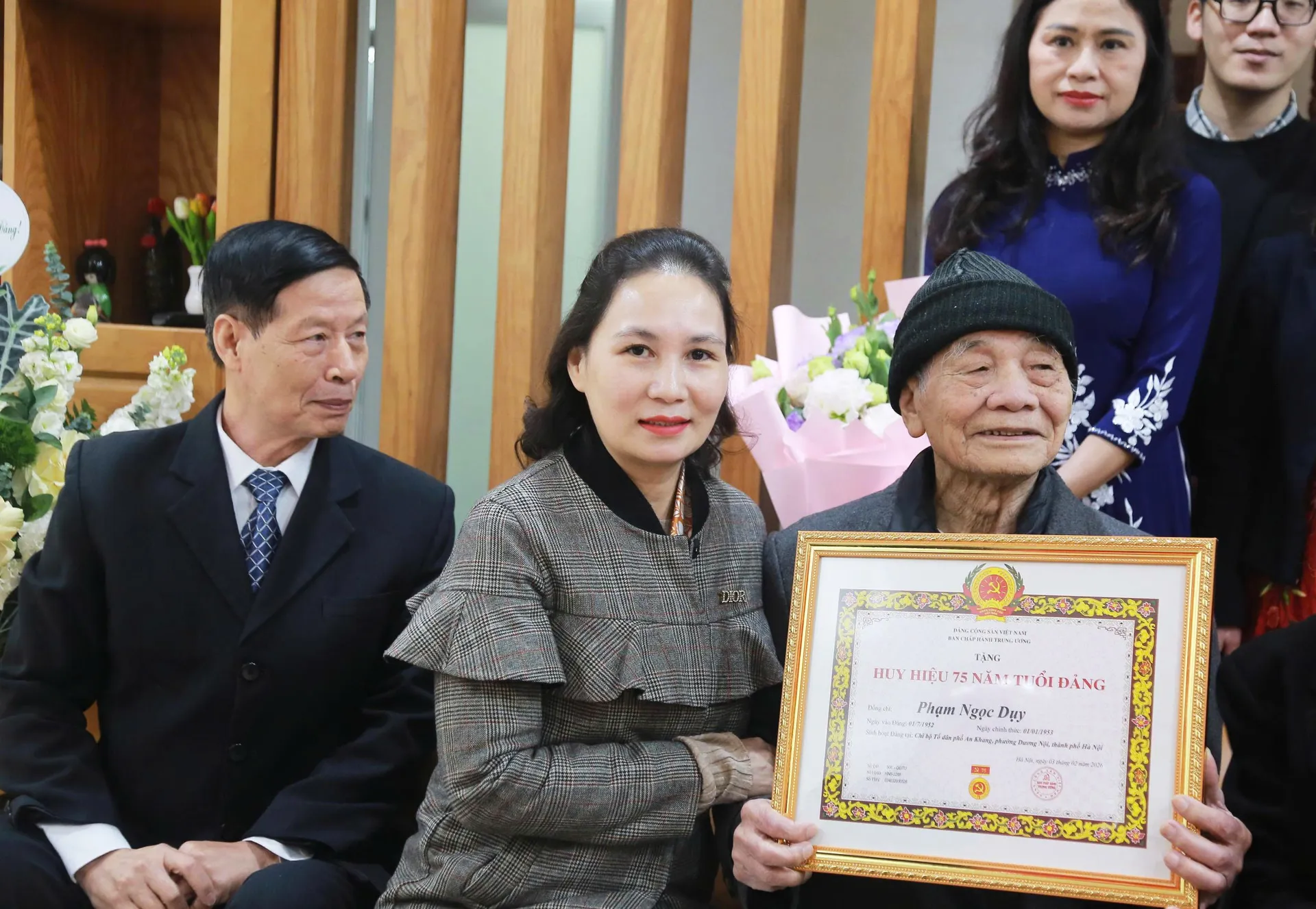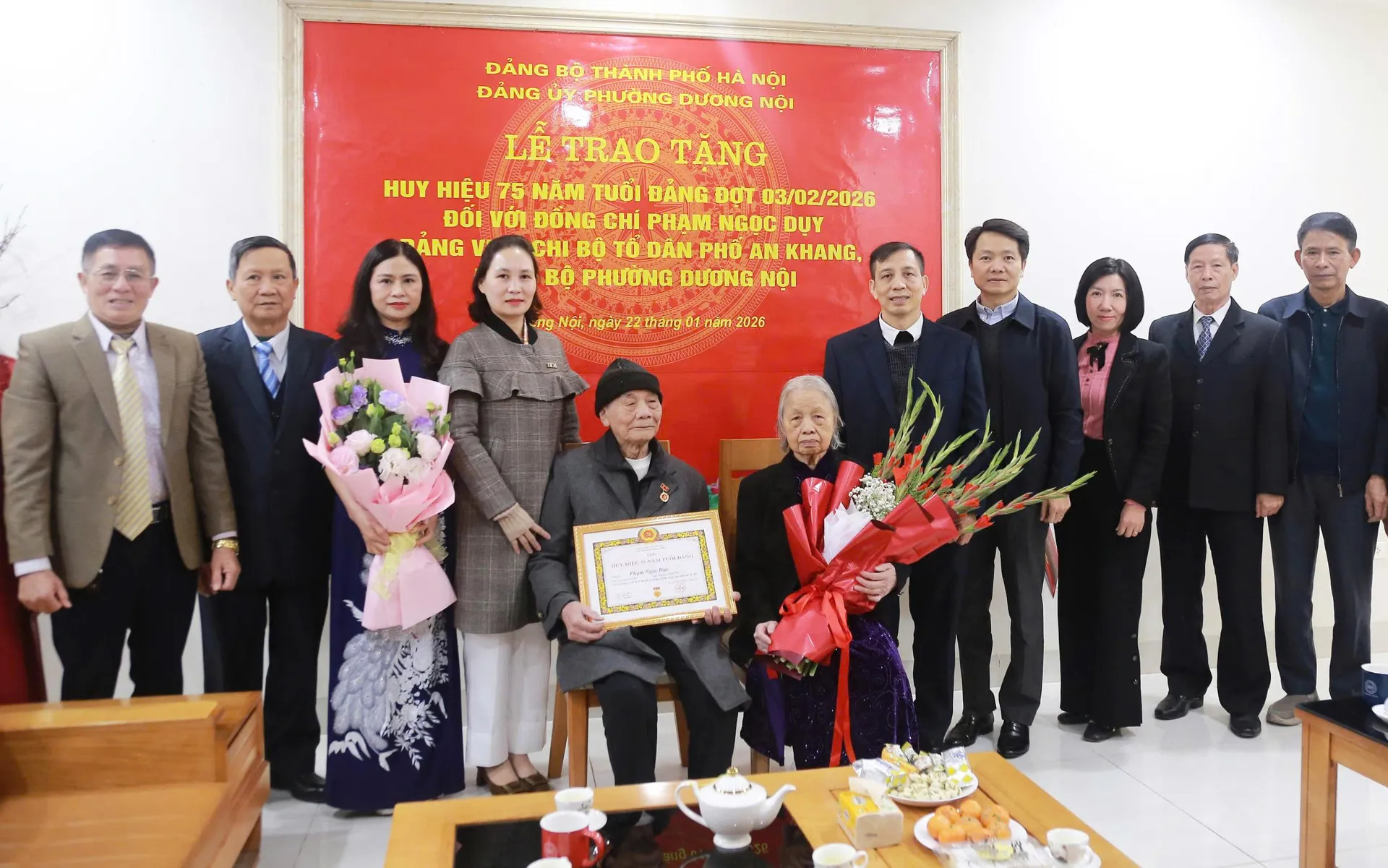 Bí thư Đảng uỷ phường, Chủ tịch HĐND phường Dương Nội Cấn Thị Việt Hà cùng đại diện Ban Xây dựng Đảng và Văn phòng Đảng ủy phường đến thăm, trao Huy hiệu 75 tuổi đảng cho đảng viên Phạm Ngọc Duỵ.