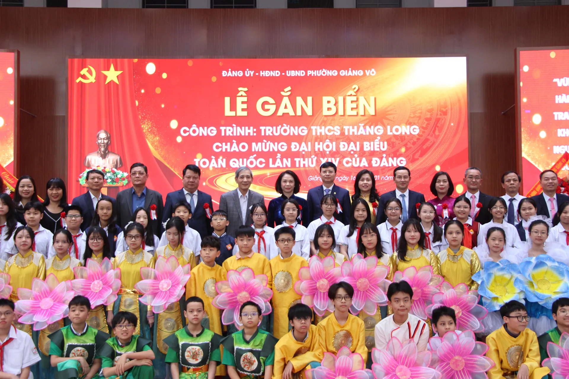 Kinhtedothi - Chiều 16/1, Đảng ủy – HĐND – UBND phường Giảng Võ tổ chức lễ gắn biển công trình chào mừng Đại hội đại biểu toàn quốc lần thứ XIV của Đảng tại trường THCS Thăng Long. Phó Chủ tịch UBND TP Hà Nội Vũ Thu Hà dự buổi lễ.
