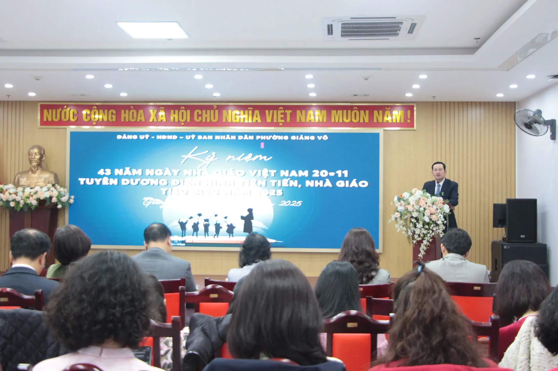 Phát biểu tại buổi lễ, Chủ tịch UBND phường Giảng Võ Cồ Như Dũng nhấn mạnh, trong thời gian qua, Đảng và Nhà nước ta luôn dành sự quan tâm đặc biệt đối với đội ngũ nhà giáo, lực lượng quyết định sự thành công của nền giáo dục. Tại Nghị quyết Đại hội đại biểu lần thứ I Đảng bộ phường Giảng Võ, nhiệm kỳ 2025 - 2030, một trong các khâu đột phá của nhiệm kỳ 2025 - 2030 đã được xác định đó là: “Phát triển giáo dục toàn diện và xây dựng môi trường giáo dục số hoá, hiện đại, linh hoạt, đổi mới sáng tạo và hội nhập quốc tế; ứng dụng công nghệ thông tin, chuyển đổi số, trí tuệ nhân tạo trong ngành Giáo dục đào tạo; giữ vững giáo dục và đào tạo trong nhóm dẫn đầu thành phố”.