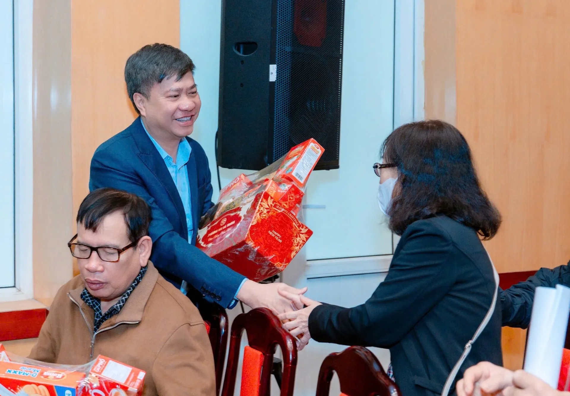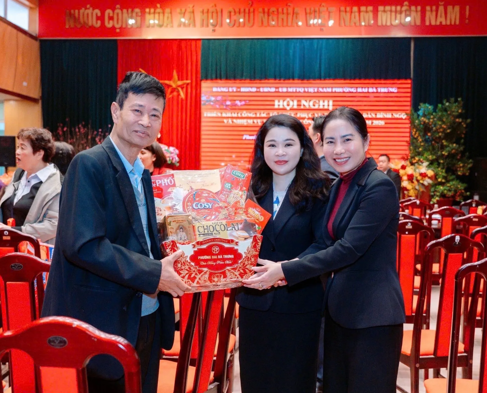 Bí thư Đảng ủy, Chủ tịch HĐND phường Hai Bà Trưng Chu Hồng Minh và các đồng chí lãnh đạo phường trao tặng quà Tết tới các cán bộ cơ sở