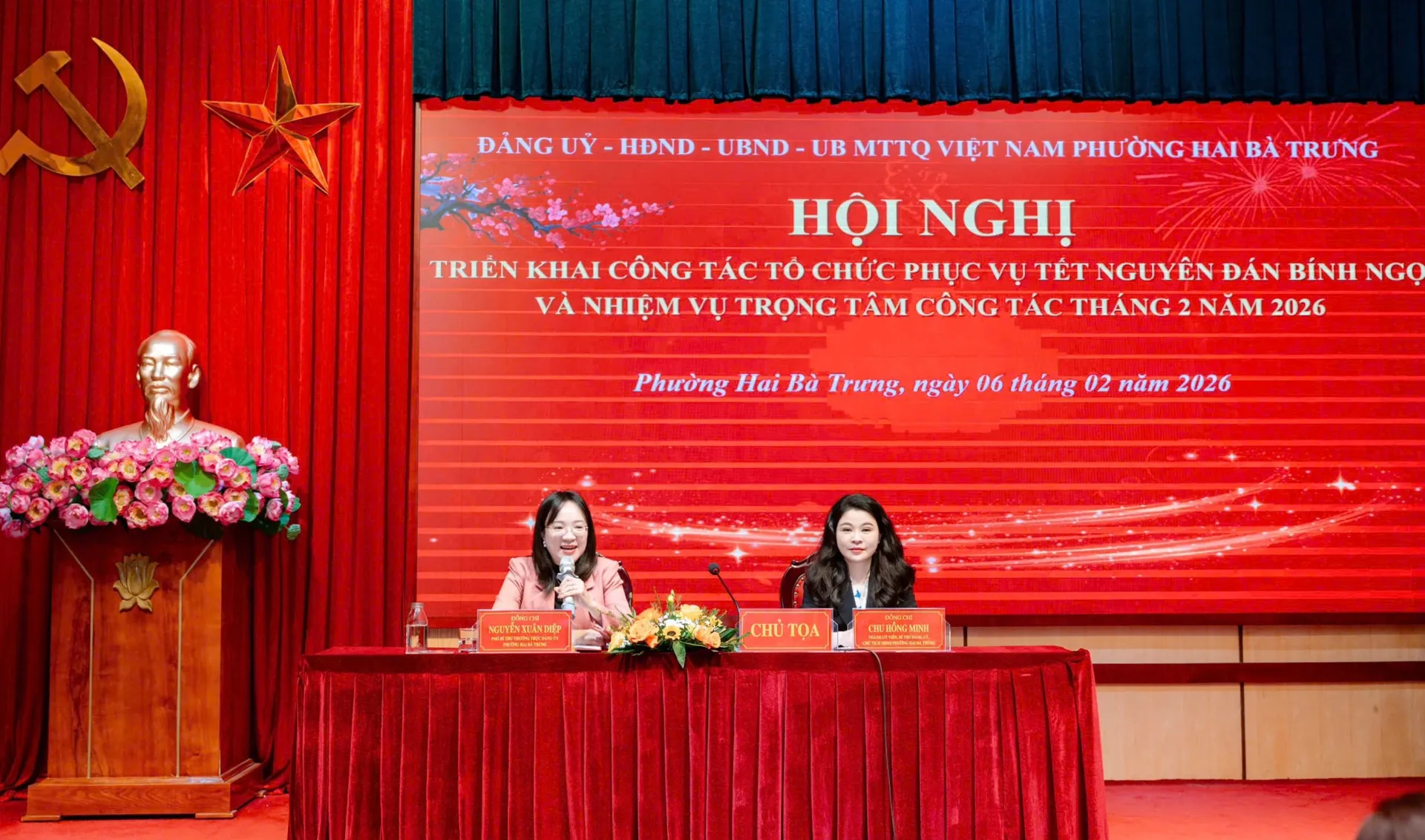 Trong không khí phấn khởi chào mừng thành công Đại hội lần thứ XIV của Đảng và chuẩn bị đón Xuân Bính Ngọ 2026, sáng nay, 6/2, Đảng ủy - HĐND - UBND - UB MTTQ Việt Nam phường Hai Bà Trưng trang trọng tổ chức Hội nghị tiếp nhận tổ chức đảng và đảng viên, tuyên dương các đồng chí Bí thư Chi bộ tiêu biểu năm 2026, giao ban quý I/2026 với cán bộ tổ dân phố (TDP).