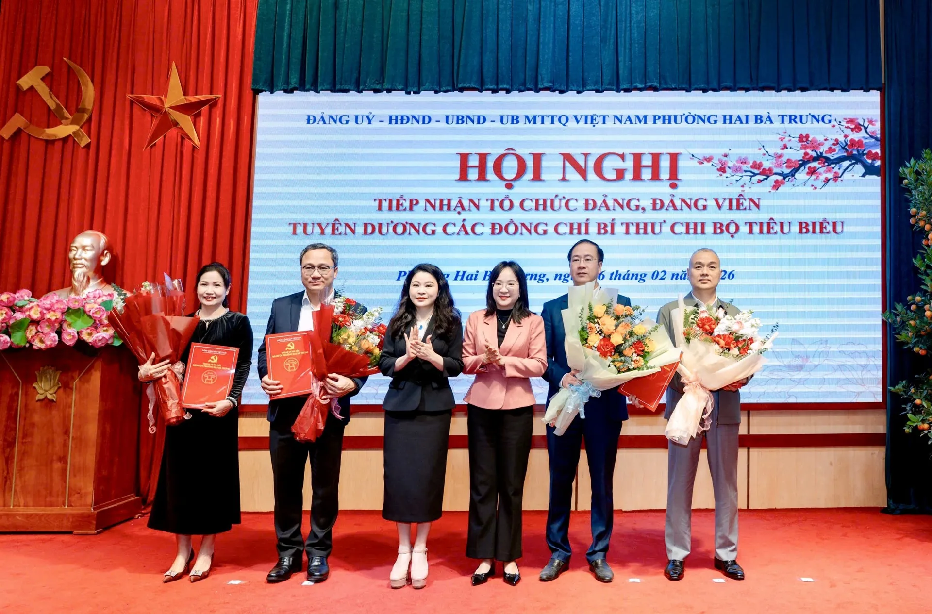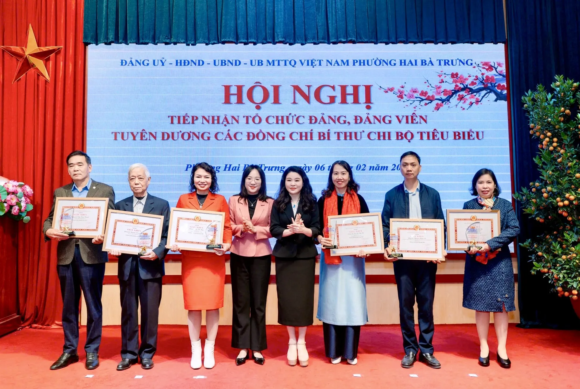 Đặc biệt tại Hội nghị, các đồng chí Thường trực Đảng ủy phường, Ban Thường vụ Đảng ủy phường đã tuyên dương, trao Giấy khen của Ban Thường vụ Đảng ủy phường Hai Bà Trưng và tặng thưởng 8 đồng chí Bí thư Chi bộ tiêu biểu năm 2026, đó là Bí thư các chi bộ: Chi bộ Khoa Nội tim mạch - Đảng ủy Bệnh viện Hữu Nghị, Chi bộ Mắt trẻ em - Đảng bộ Bệnh viện Mắt Trung ương, Chi bộ Công ty TNHH Thương Mại Việt Tuấn - Đảng bộ Doanh nghiệp phường, Chi bộ 1 - Đảng bộ Trung tâm Nghiên cứu, sản xuất vaccine và sinh phẩm y tế, Chi bộ Trường THCS Lê Ngọc Hân, Chi bộ Trường THPT Trần Nhân Tông, Chi bộ TDP số 1, Chi bộ TDP số 29.