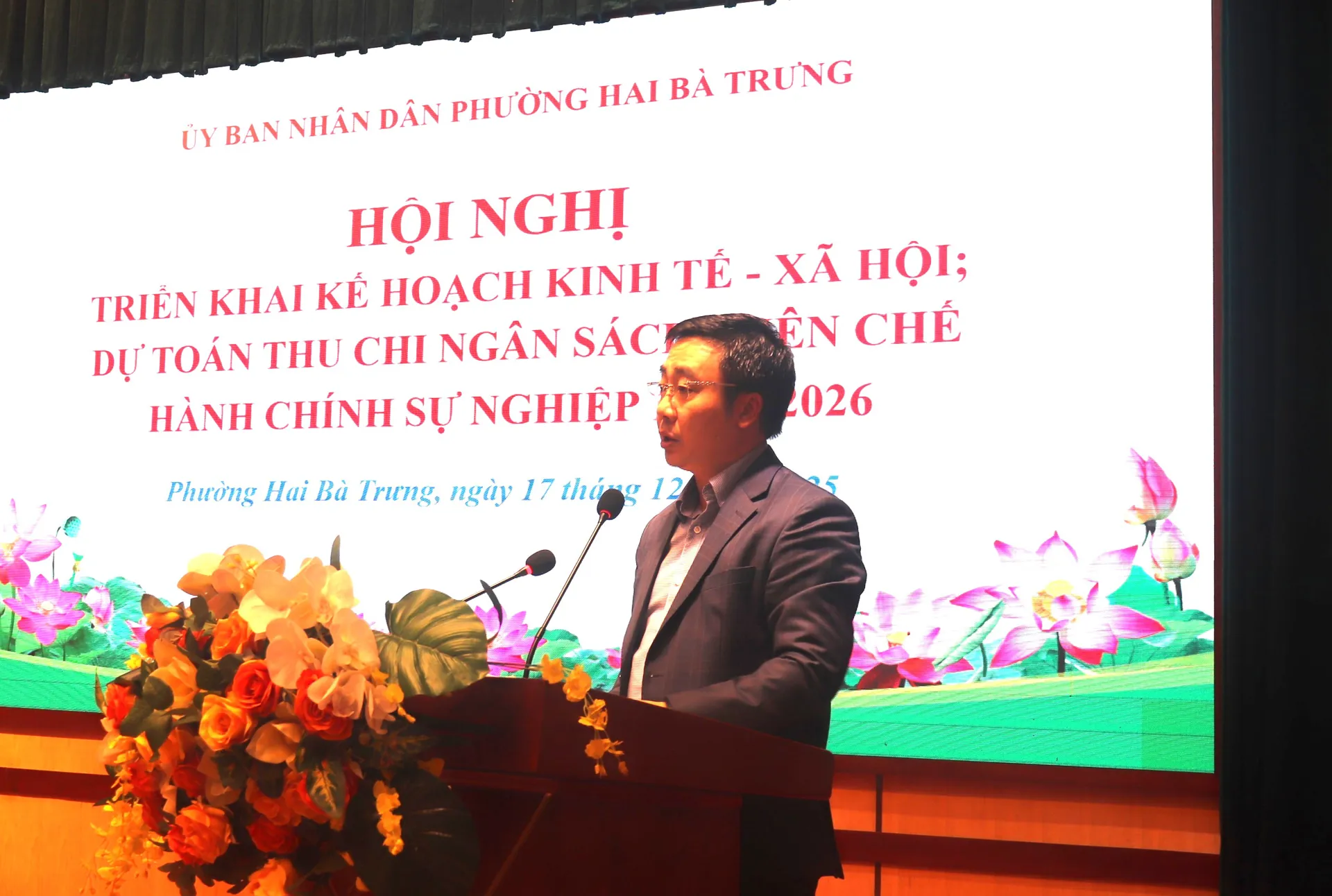 Tại Hội nghị, Chánh Văn phòng HĐND&UBND phường Hai Bà Trưng Nguyễn Minh Hương công bố Quyết định số 2035/QĐ-UBND ngày 8/12/2025 của UBND phường Hai Bà Trưng về việc giao chỉ tiêu kế hoạch phát triển KT-XH; dự toán thu, chi ngân sách; biên chế hành chính, sự nghiệp; khoa học và công nghệ (KHCN) năm 2026 của phường Hai Bà Trưng.