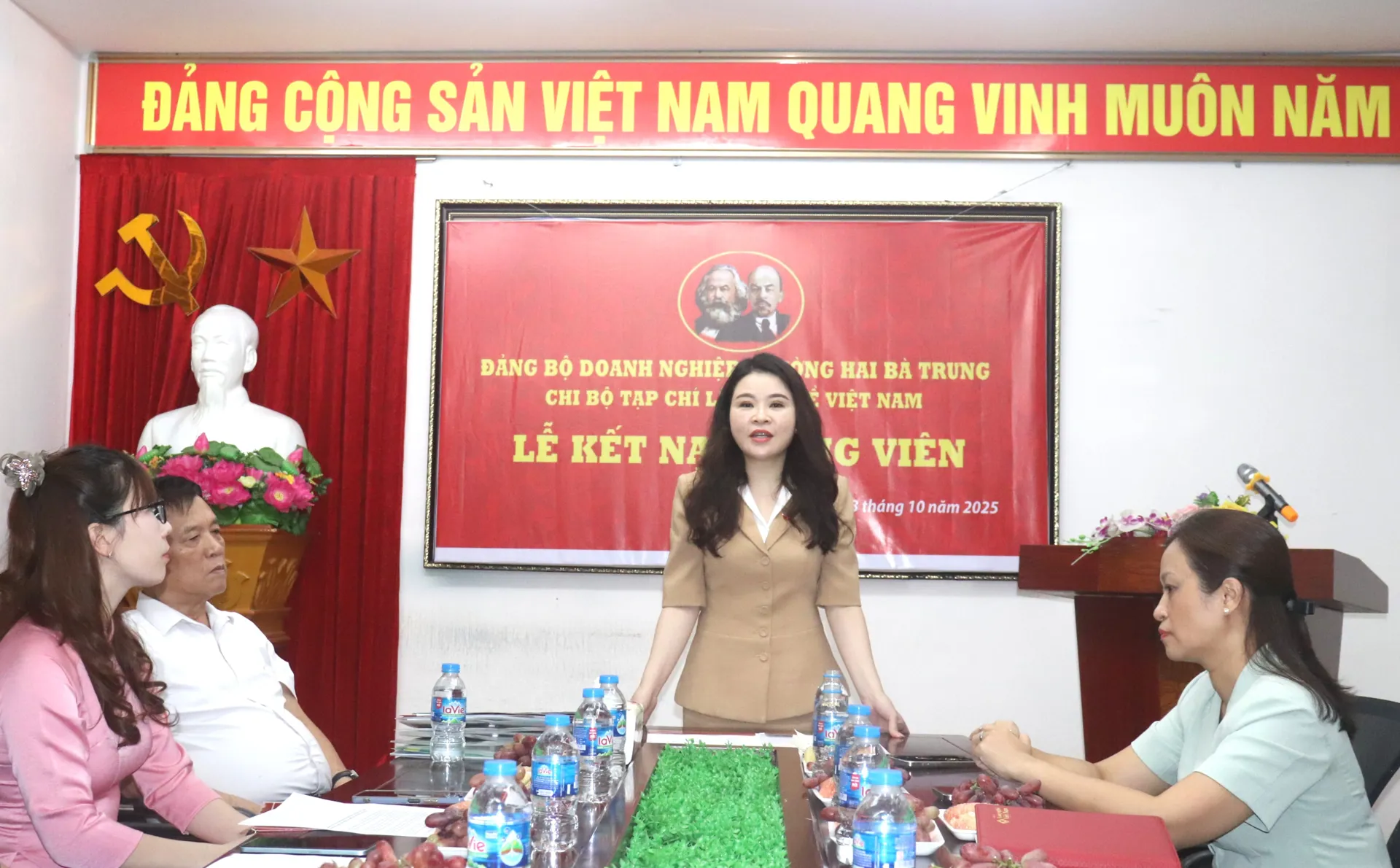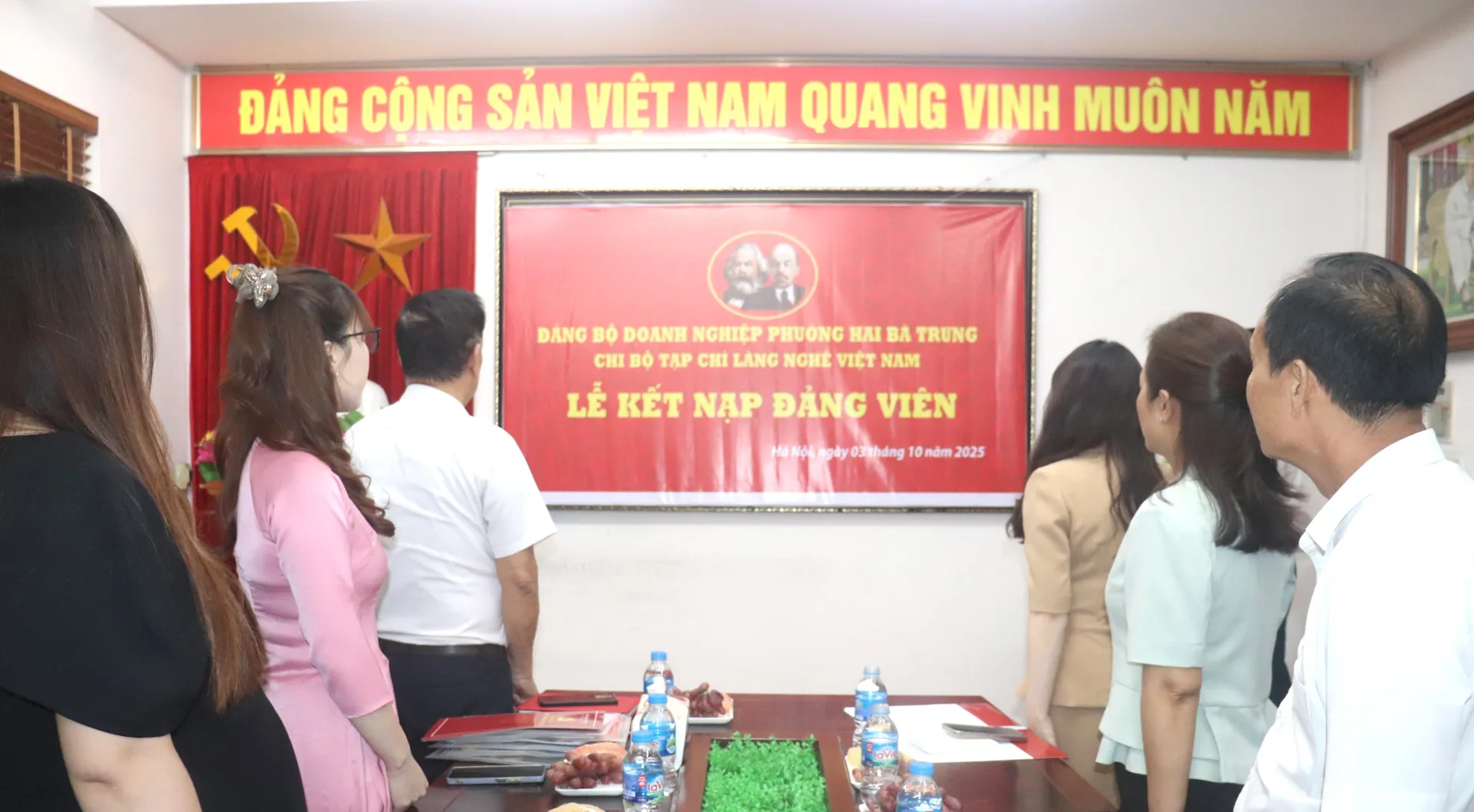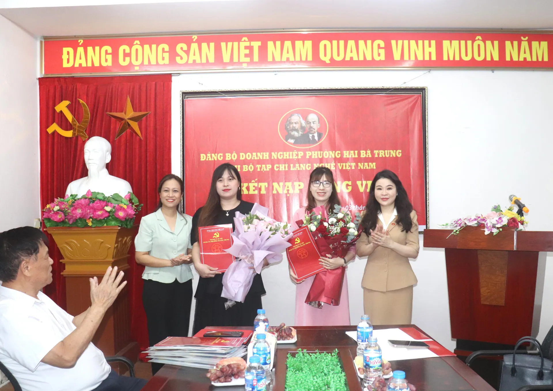 Tại đây, đại diện Chi bộ Tạp chí Làng nghề công bố 2 Quyết định ngày 24/9/2025 của Đảng ủy phường Hai Bà Trưng về việc kết nạp đảng viên. Theo đó, Ban Thường vụ Đảng ủy phường quyết định kết nạp quần chúng Nguyễn Thị Tú, sinh ngày 24/8/1990, quê quán tại xã Phù Đổng, TP Hà Nội và quần chúng Hoàng Ngọc Mai, sinh ngày 3/9/1995, quê quán tại xã Vĩnh Lộc, tỉnh Nghệ An vào Đảng Cộng sản Việt Nam và phải trải qua thời gian dự bị 12 tháng kể từ ngày Chi bộ tổ chức lễ kết nạp.