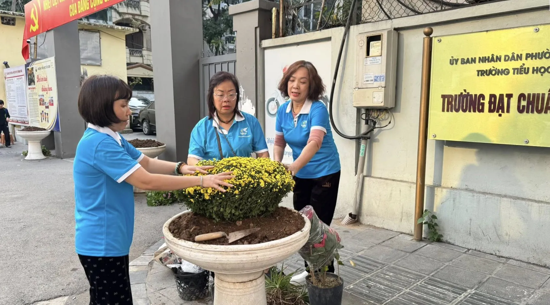 Cán bộ, hội viện phụ nữ phường Hai Bà Trưng tổ chức trồng hoa trước cổng trường Tiểu học Tây Sơn chào mừng Đại hội đại biểu toàn quốc lần thứ XIV của Đảng
