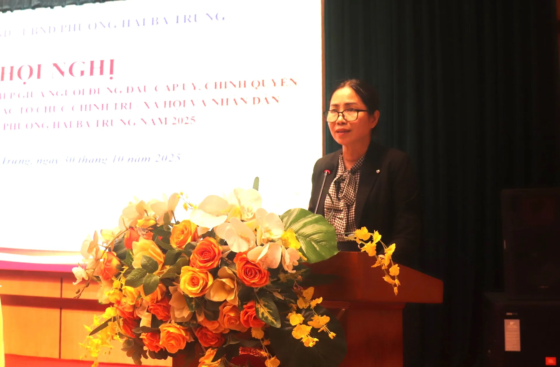 Tại đây, Ủy viên Ban Thường vụ Đảng ủy, Phó Chủ tịch UBND phường Hai Bà Trưng Đỗ Phương Nga đã thông tin tình hình phát triển KT-XH, các nhiệm vụ chính trị quý III/2025 và nhiệm vụ trọng tâm quý IV/2025 của phường; báo cáo tổng hợp của phường trả lời ý kiến, kiến nghị của Nhân dân về các lĩnh vực quản lý Nhà nước tại địa phương. Ủy viên Ban Thường vụ, Trưởng ban Xây dựng Đảng - Đảng ủy phường Hai Bà Trưng Vũ Thanh Loan báo cáo tổng hợp của phường trả lời ý kiến, kiến nghị của Nhân dân về các lĩnh vực xây dựng Đảng, chính quyền.