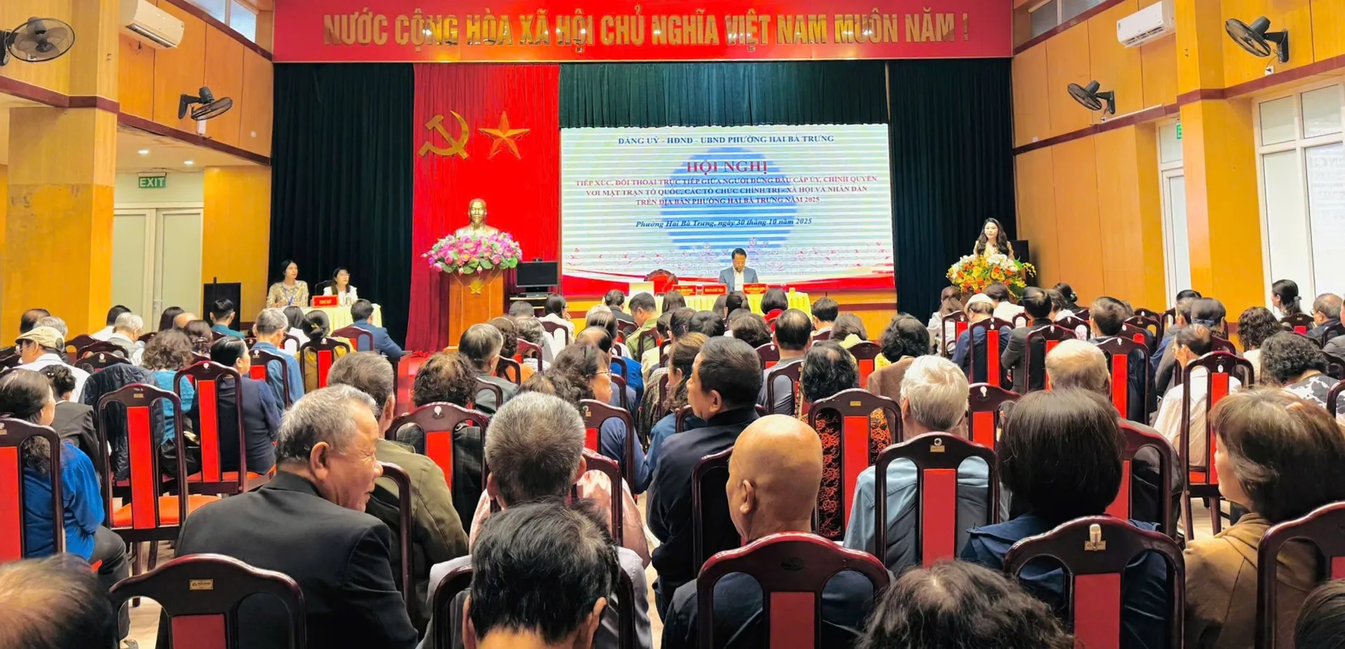 Quang cảnh Hội nghị tiếp xúc, đối thoại trực tiếp giữa người đứng đầu cấp ủy, chính quyền với MTTQ, các tổ chức CT-XH và đại diện Nhân dân trên địa bàn phường Hai Bà Trưng năm 2025