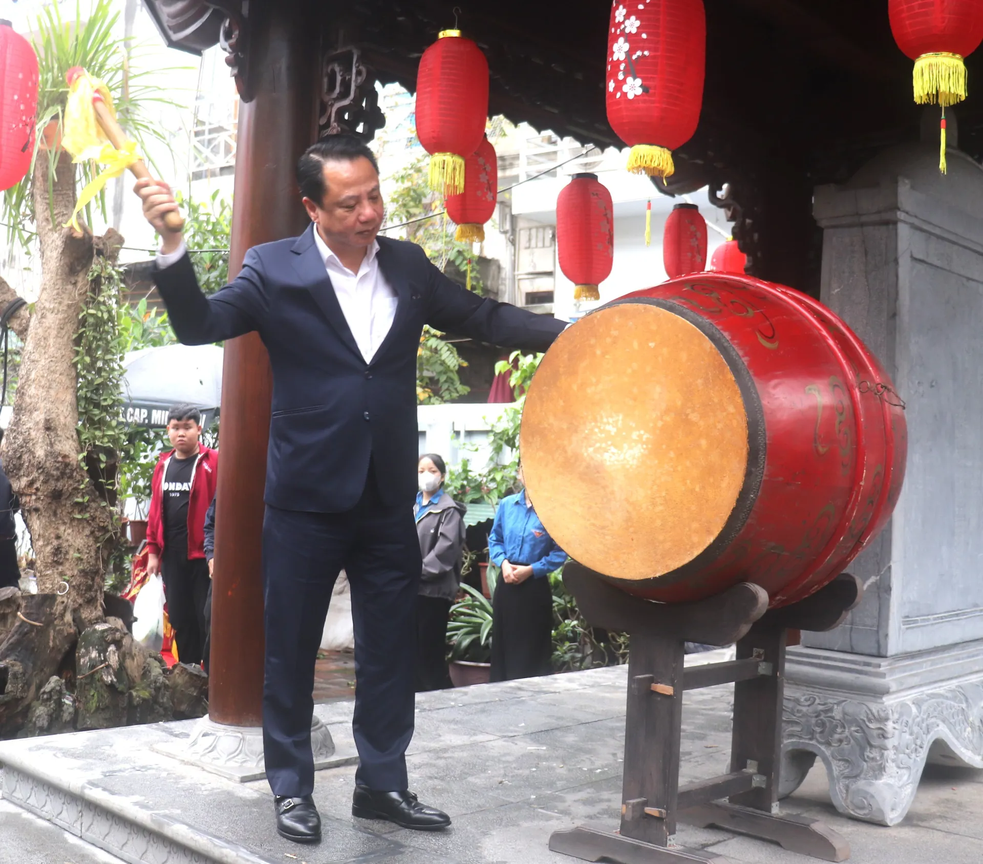 Phó Bí thư Đảng ủy, Chủ tịch UBND phường Hai Bà Trưng Nguyễn Mạnh Hùng đánh trống khai mạc Lễ hội Chùa Vua